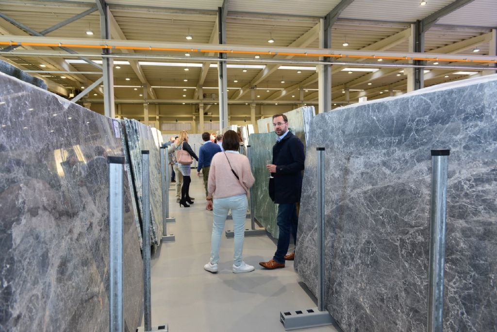 "Daarna gaan we in de Stone Gallery de natuursteenplaten bekijken en selecteren die het best bij hun keuze aansluiten. Door de schikking van de platen kan men ze zowel van dichtbij als vanop een ruime afstand zien, voelen en bewonderen. Door de imposante glaspartijen in de hal, hebben we er zo voor gezorgd dat er voldoende daglicht naar binnen valt om de platen in de juiste omstandigheden tot hun recht te laten komen."