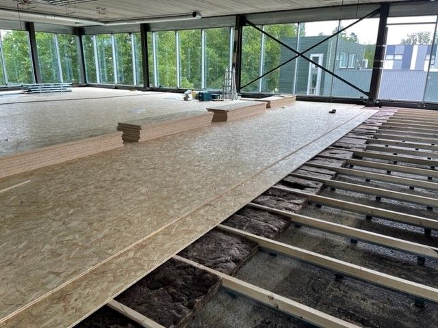 - de installatie van een licht zwevend vloersysteem over de volledige vloeroppervlakte, op basis van veerregels type Stravifloor Channel met rubberpads van 50 mm dik en met bovenop een dubbele OSB-beplating. Een massieve zwevende vloer zou immers te zwaar zijn geweest voor de bestaande dakstructuur;