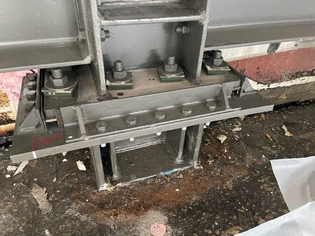 - de structurele ontkoppeling van de stalen kolommen onderaan via een Stravibase Fix systeem afgeveerd op ca. 20Hz. Om de windkrachten op te vangen werden extra verstevigingen rondomrond voorzien, met tussenvoeging van een rubberstrook aangebracht tegen de verticale opstand (om geen hard zijdelings contact te hebben);