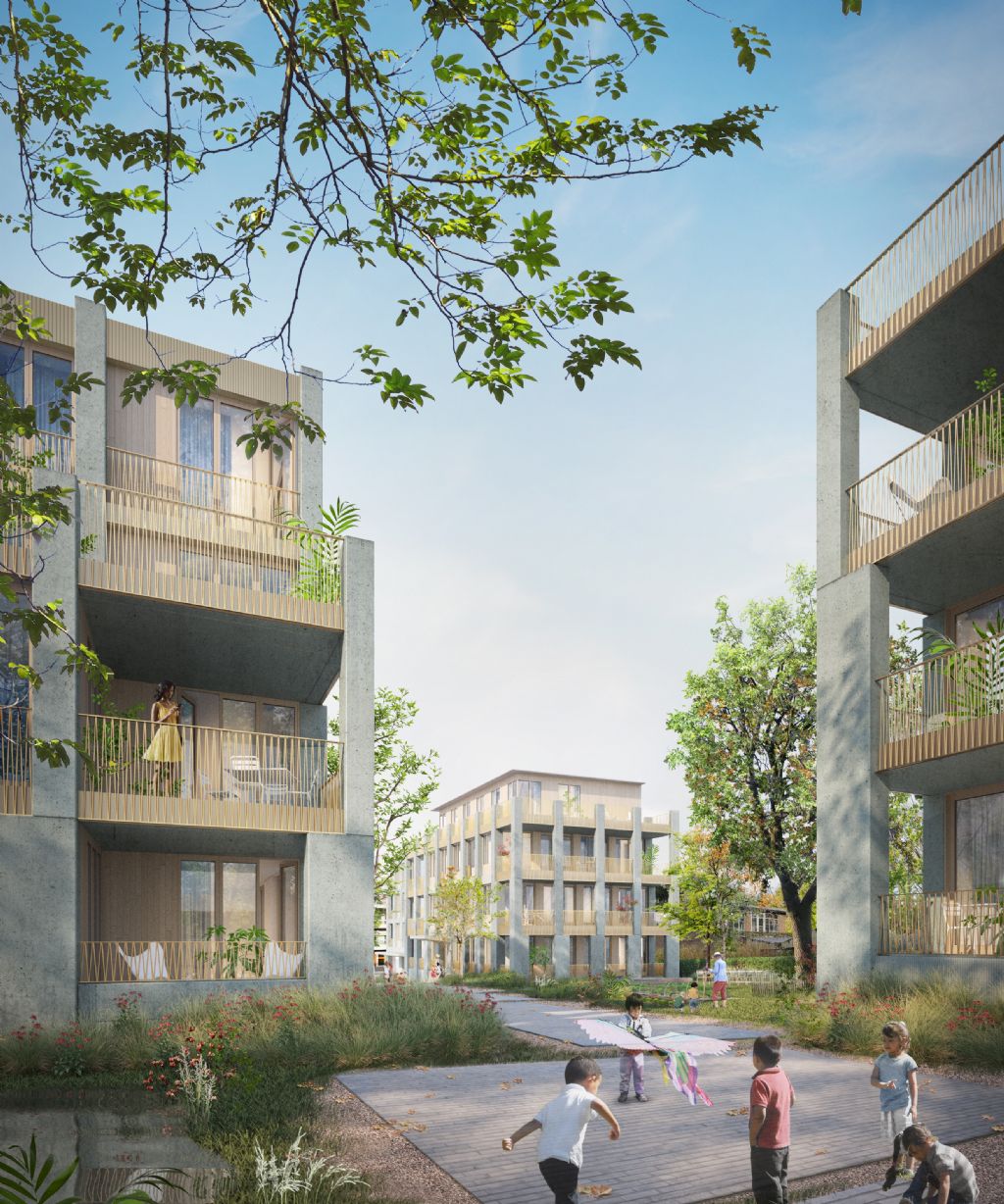De volumetrie van de gebouwen, en de mix van woningtypes, passen zich aan deze nieuwe landschappelijke context aan. De plaatsing van de gebouwen zorgt voor een grote doorwaadbaarheid, en voor aansluiting op de bestaande groenkwaliteiten op de aanpalende percelen.