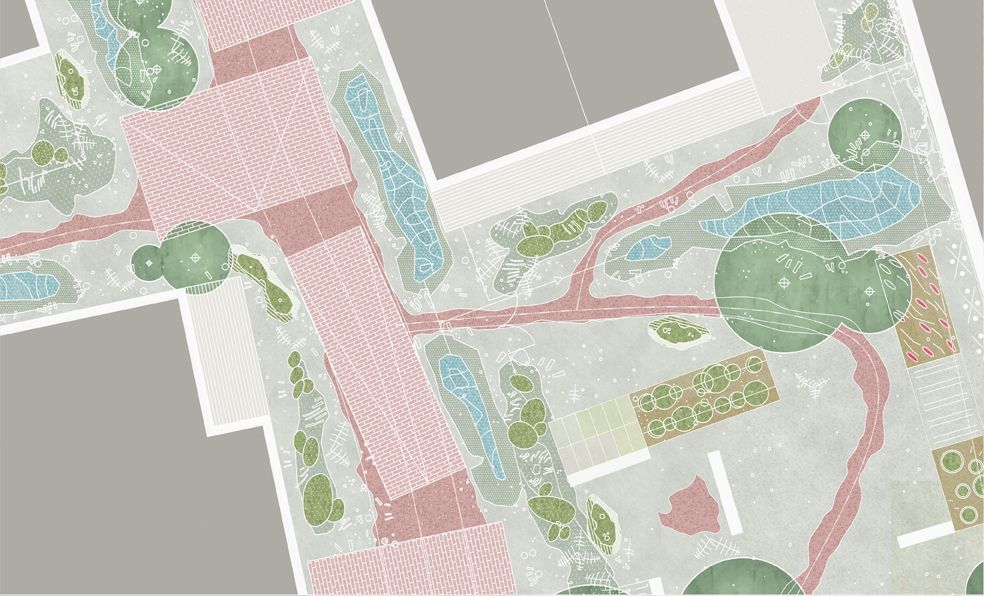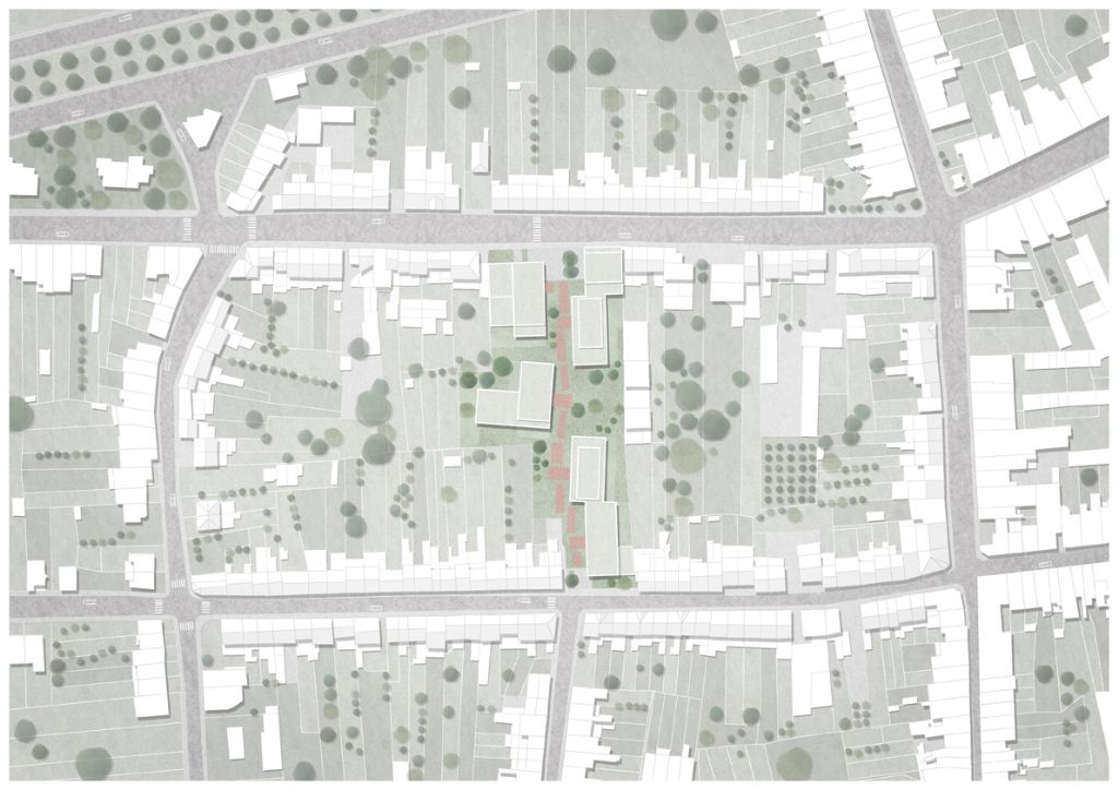 De bestaande onderwijscampus werd gekenmerkt werd door ruimtelijke schaalsprongen, een gesloten karakter, en een in hoofdzaak verhard maaiveld. In de nieuwe woonontwikkeling structureren vier gebouwen een publieke en landschappelijke doorsteek door het bouwblok. Deze open en groene ruimte - waaraan zich ook een aantal collectieve functies (bv. een kinderdagverblijf en moestuinen) scharen - is autovrij en wordt ontworpen vanuit een versterking van het natuurlijk biotoop, een duurzame omgang met water en het behoud van de bestaande topografie. Het publieke maaiveld maakt ruimte voor gevarieerde individuele en collectieve beleving. Moestuinen en speelplekken worden afgewisseld met meer teruggetrokken en intieme tuinkamers.