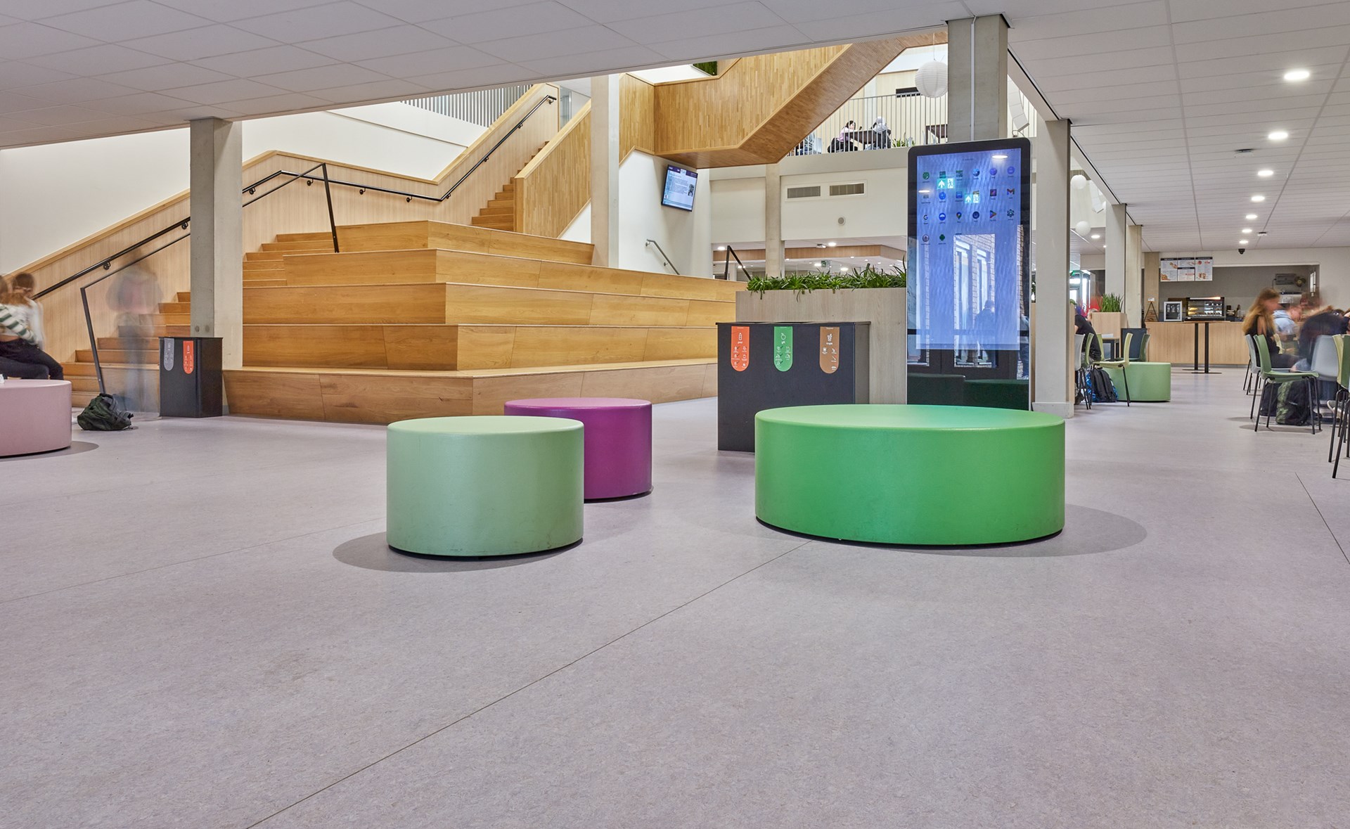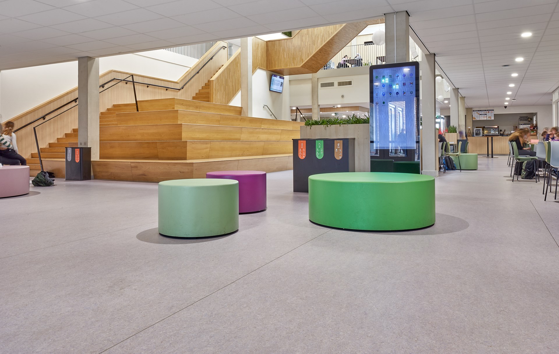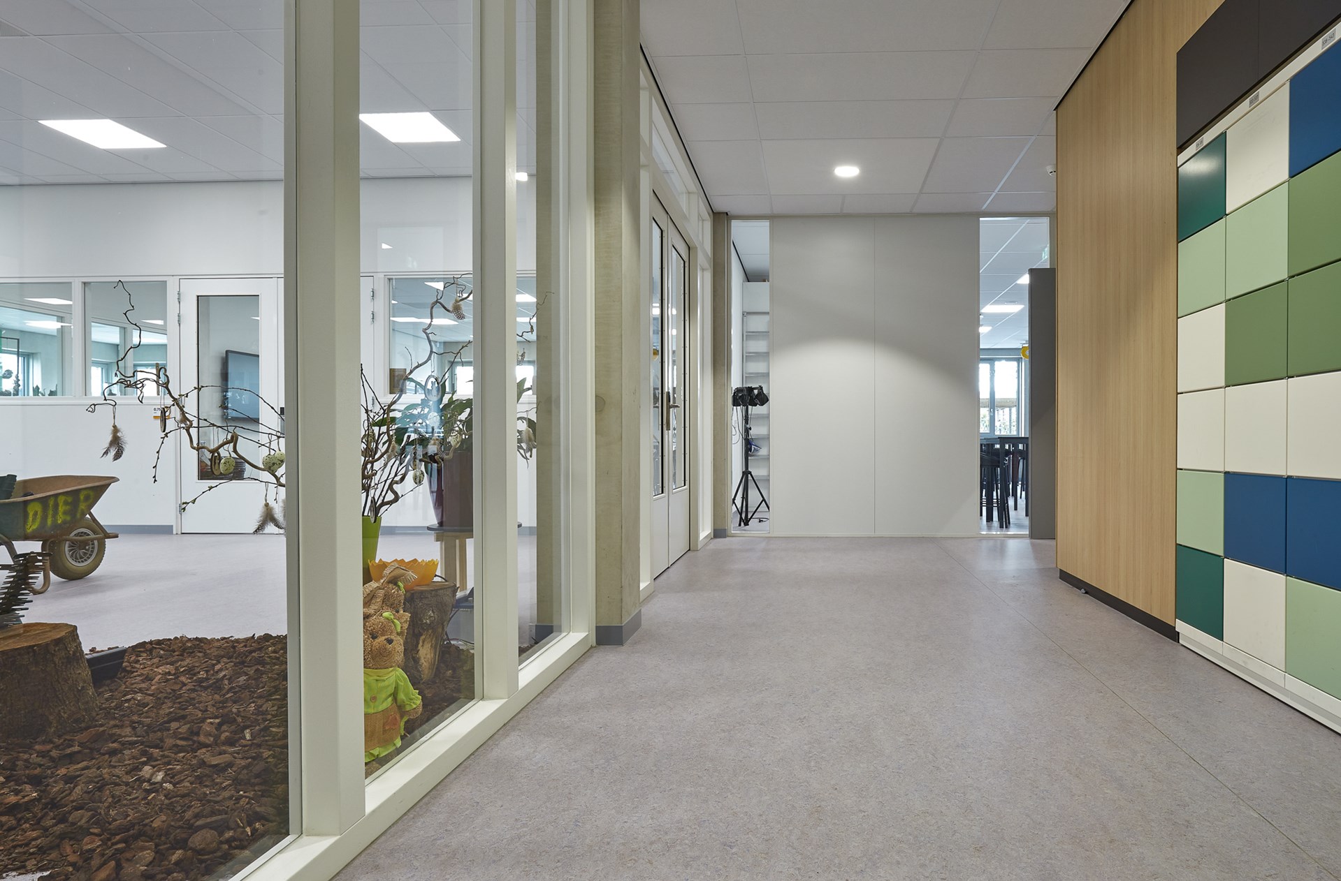 De facilitair manager merkt op dat de DLW Linoleumvloer ook een aangename dempende werking heeft op de loopgeluiden die de vele kinderen produceren. Hij lacht: “Het is hier soms net een kippenhok, dus alles wat geluid dempt is fijn. En dat doet deze vloer ontzettend goed.”