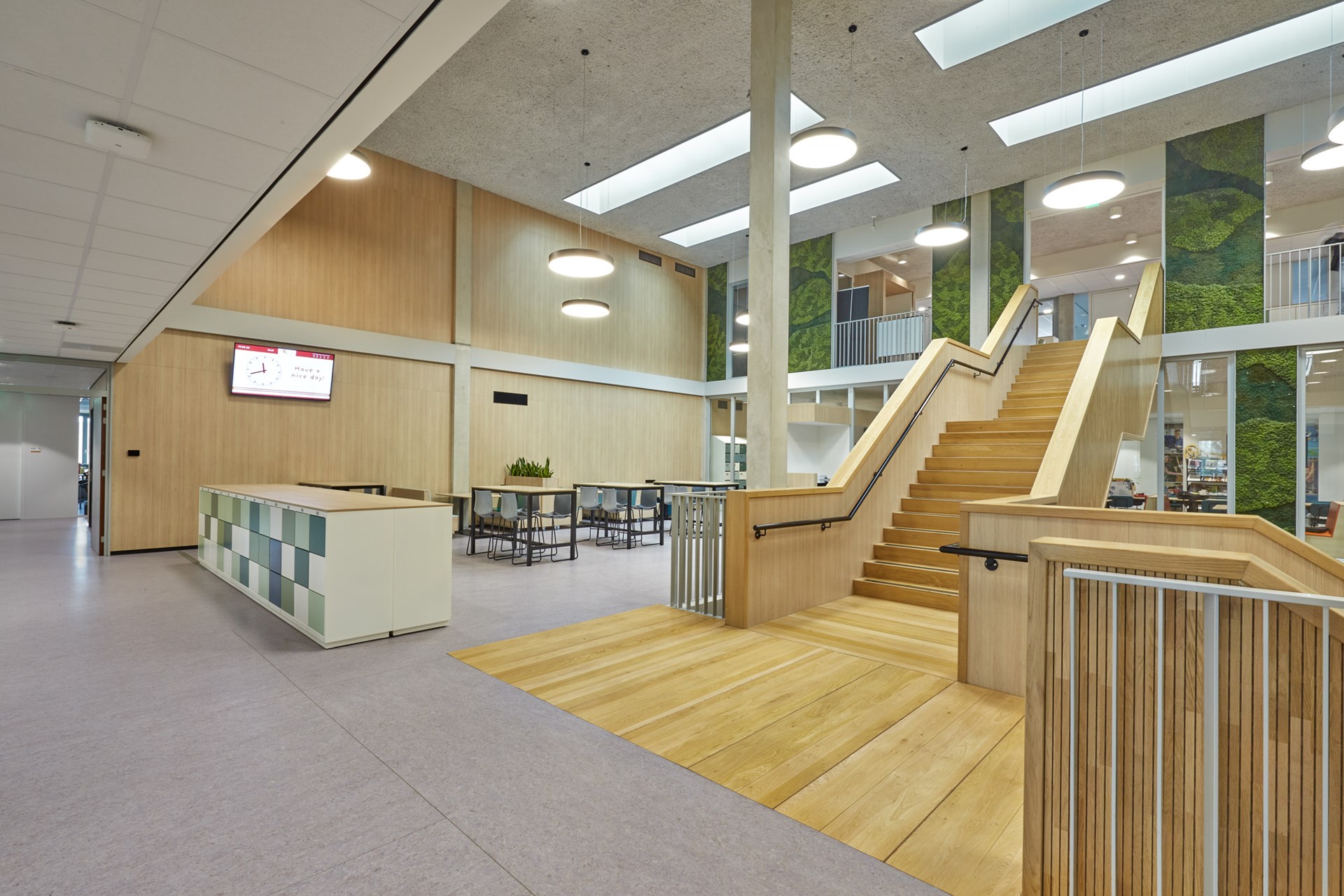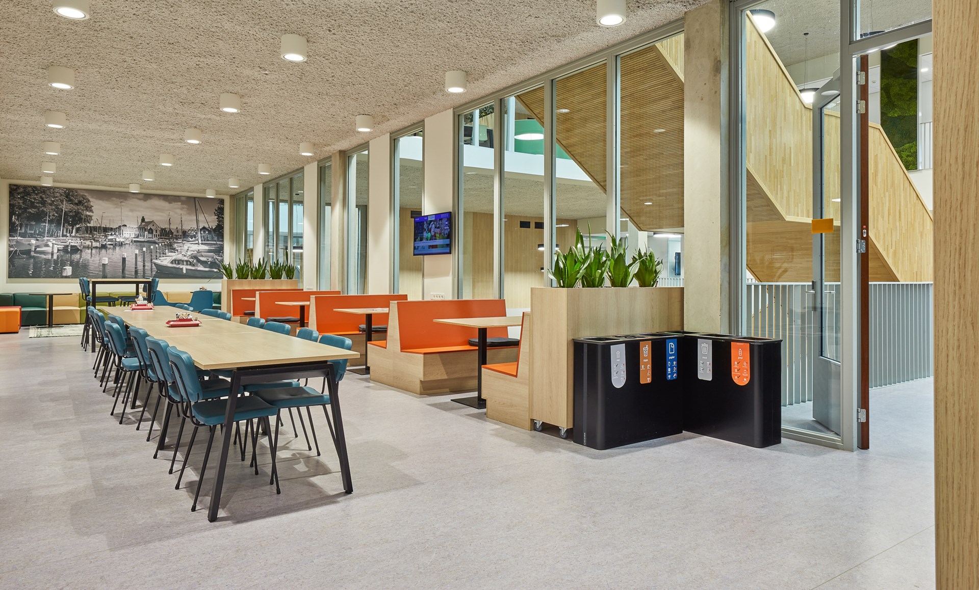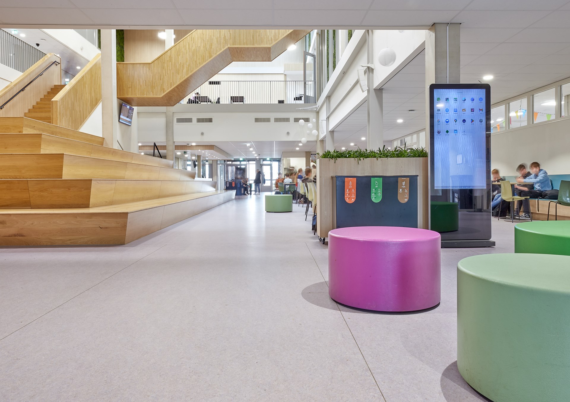 De facilitair manager merkt op dat de DLW Linoleumvloer ook een aangename dempende werking heeft op de loopgeluiden die de vele kinderen produceren. Hij lacht: “Het is hier soms net een kippenhok, dus alles wat geluid dempt is fijn. En dat doet deze vloer ontzettend goed.”