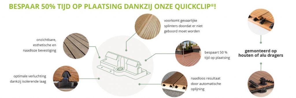 QuickClip® is een eenvoudig en onzichtbaar bevestigingssysteem voor voorgegroefde terras- en gevelbekleding. Een houten terras aanleggen of een gevel, poort en omheining bekleden: met QuickClip® is het eenvoudiger dan ooit.