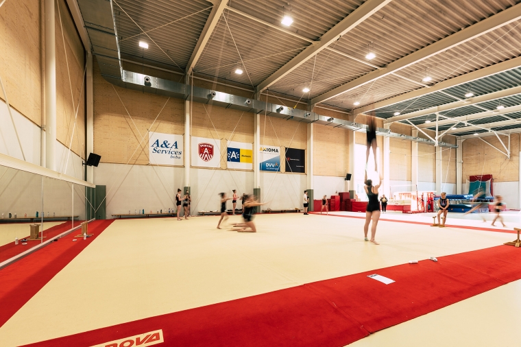 In deze gymnastiekhal in Merksem trainen de talenten van morgen in een goed geïsoleerde en akoestisch performante zaal.