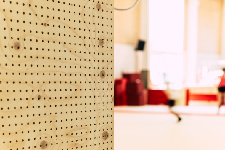 De topprestaties van Nina Derwael gaven op een bepaald moment een enorme boost aan het turnen. Eddy Van Schevensteen, bestuurder van Gymnastiekvereniging Klimop: “Gymhal Terlinden was te klein geworden voor de vele nieuwe leden en voor zoveel turntoepassingen.” Een uitbreiding was dus nodig en akoestiek kreeg in deze nieuwbouw extra aandacht. De architect ging op zoek naar een geperforeerde wandoplossing die snel geplaatst kon worden. Ben Deschepper van Met zicht op zee architecten: “We zochten een product dat op voorhand gemaakt kon worden, zodat er weinig werk was op de werf en de sporthal snel dicht was. Uiteraard in combinatie met de nodige isolatie en akoestische waarden. We hebben meerdere aannemers gecontacteerd, maar allemaal kwamen ze met dezelfde oplossing: Usystem van Unilin Insulation.”