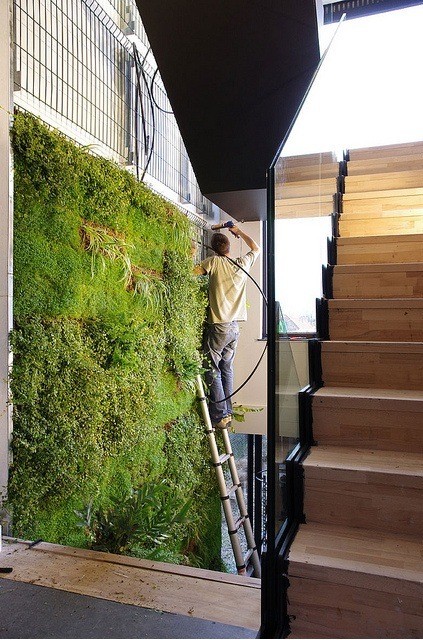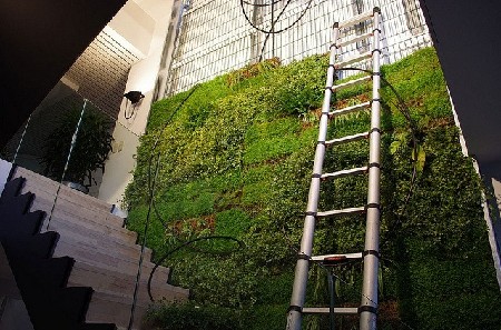 De groene wand krijgt vorm door het systeem “Vegetalis” waarbij modules, “Greenbox”, worden opgehangen aan een metalen rooster met een aluminium frame dat aan de gevelstructuur bevestigd wordt.