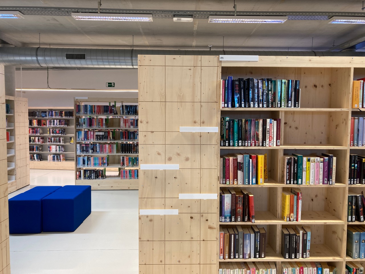 Door een strategische plaatsing van de boekenkasten creëerde Stijn Ruys gangen en verschillende ruimtes in de vernieuwde bib. De boekenkasten kunnen in de toekomst eenvoudig een andere plaats krijgen om die indeling te veranderen, wat de bib aanpasbaar maakt en ze een multifunctioneler karakter geeft. Studeren, lezingen of kleine voorstellingen geven, vergaderen: het kan allemaal in de vernieuwde bibliotheek.