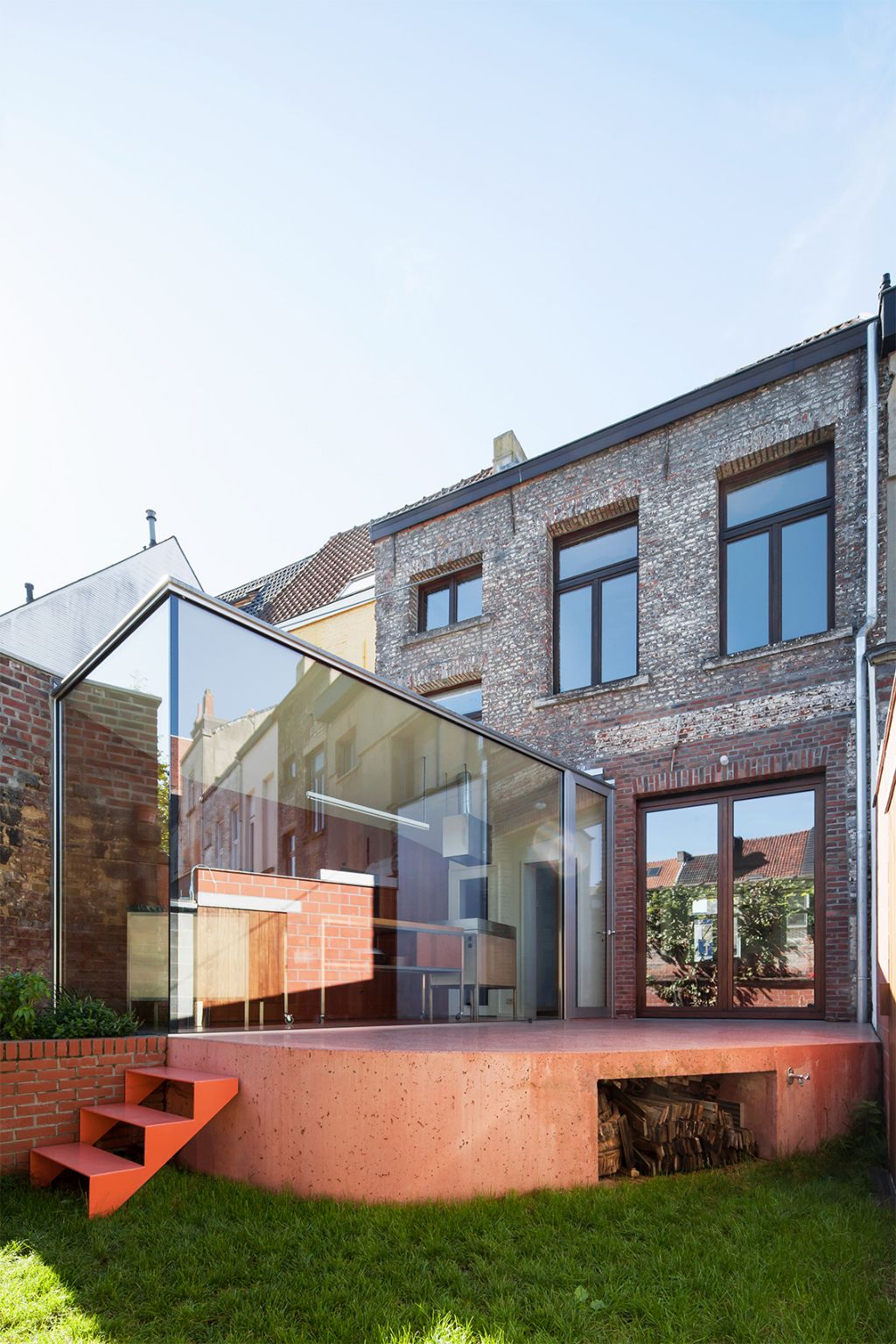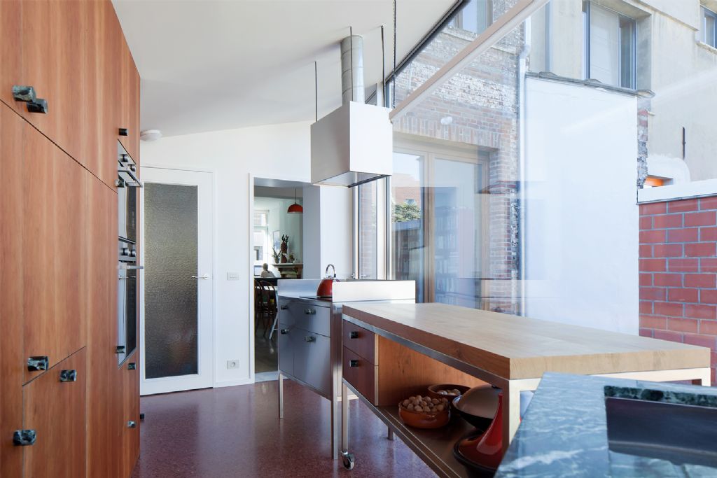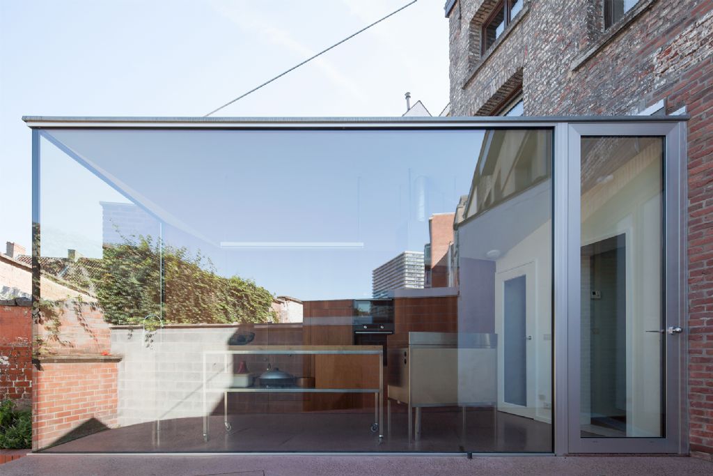 Het dak van de keuken hangt op aan de achtergevel van de oude woning door middel van een externe inox trekkabel. Daardoor blijft de buitenhoek gevrijwaard van een kolom. De wanden gericht naar de stadstuin zijn herleid tot twee glasplaten en een deur die in een hoek tegen elkaar geplaatst werden.