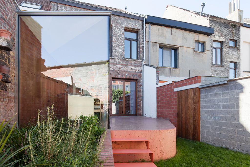 MARCEL creëerde bij de verbouwing van een woning in Gent de toevoeging van een 'open' keuken die de relatie tussen de verschillende ruimtes van de woning en de tuin versterkt. Ook het sokkelvormige terras springt in het oog.