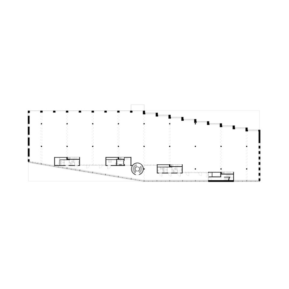 Het gebouw zelf is eveneens georganiseerd in stroken: kantoren aan de noordzijde door middel van verticale kernen gescheiden van de circulatiestrook aan de zuidzijde. De circulatiestrook functioneert als klimatologische en akoestische buffer voor de zonnewinsten en verkeersdrukte aan de zuidgevel. Het prismatische volume wordt aan beide langse gevels teruggetrokken om enerzijds de inrit van de parking te organiseren en anderzijds de luchttoe- en afvoer van de technische installaties toe te laten. Op die manier ontstaan de bijzondere genikte zuidgevel en gekartelde noordgevel.