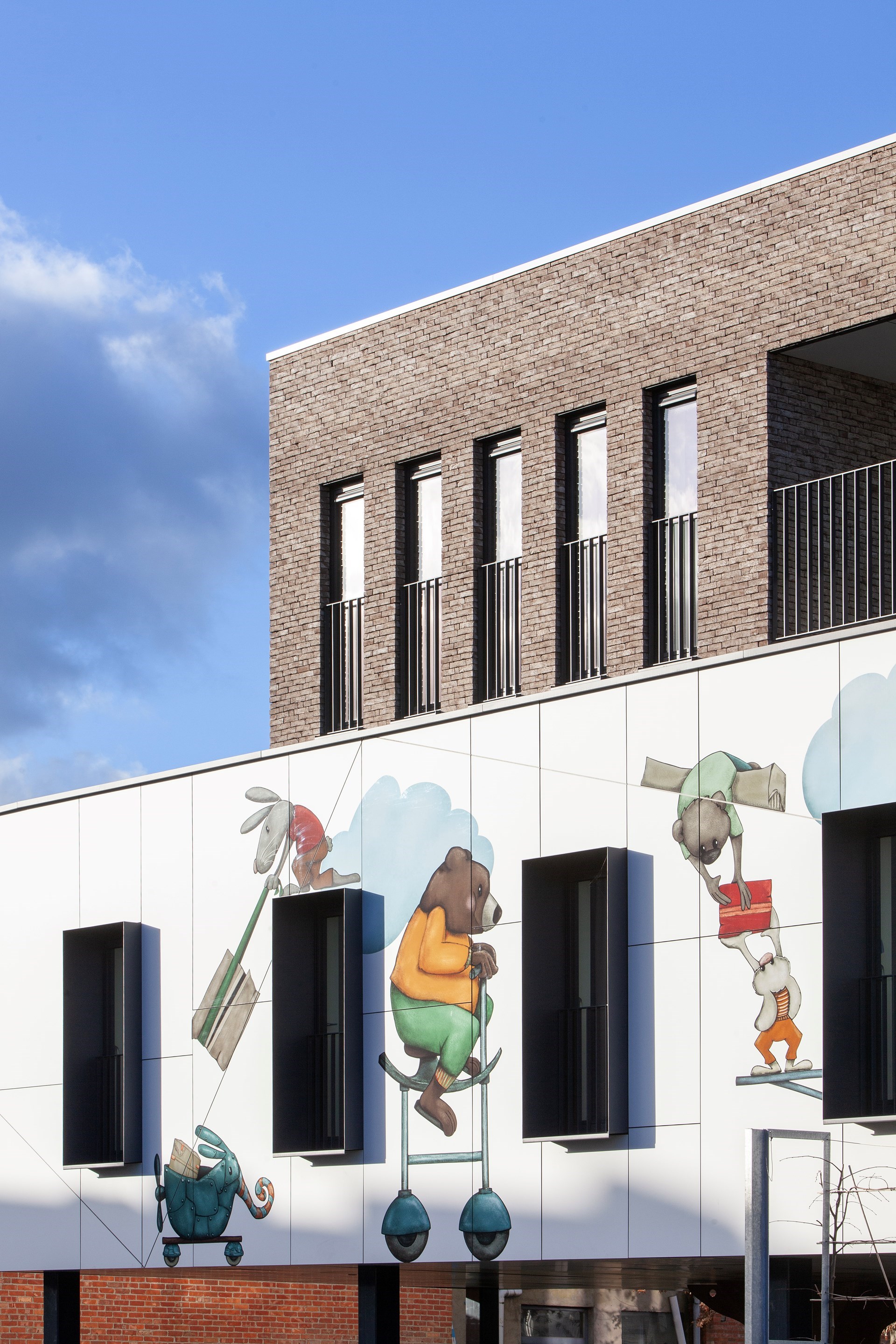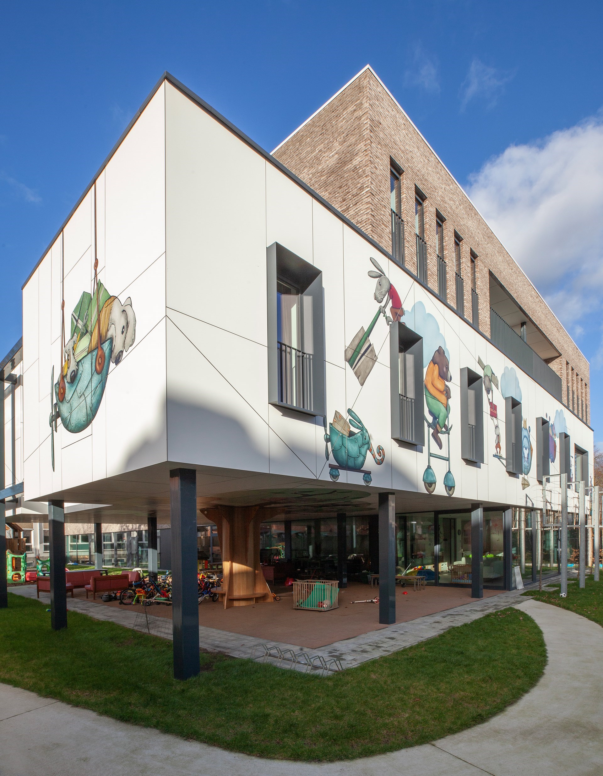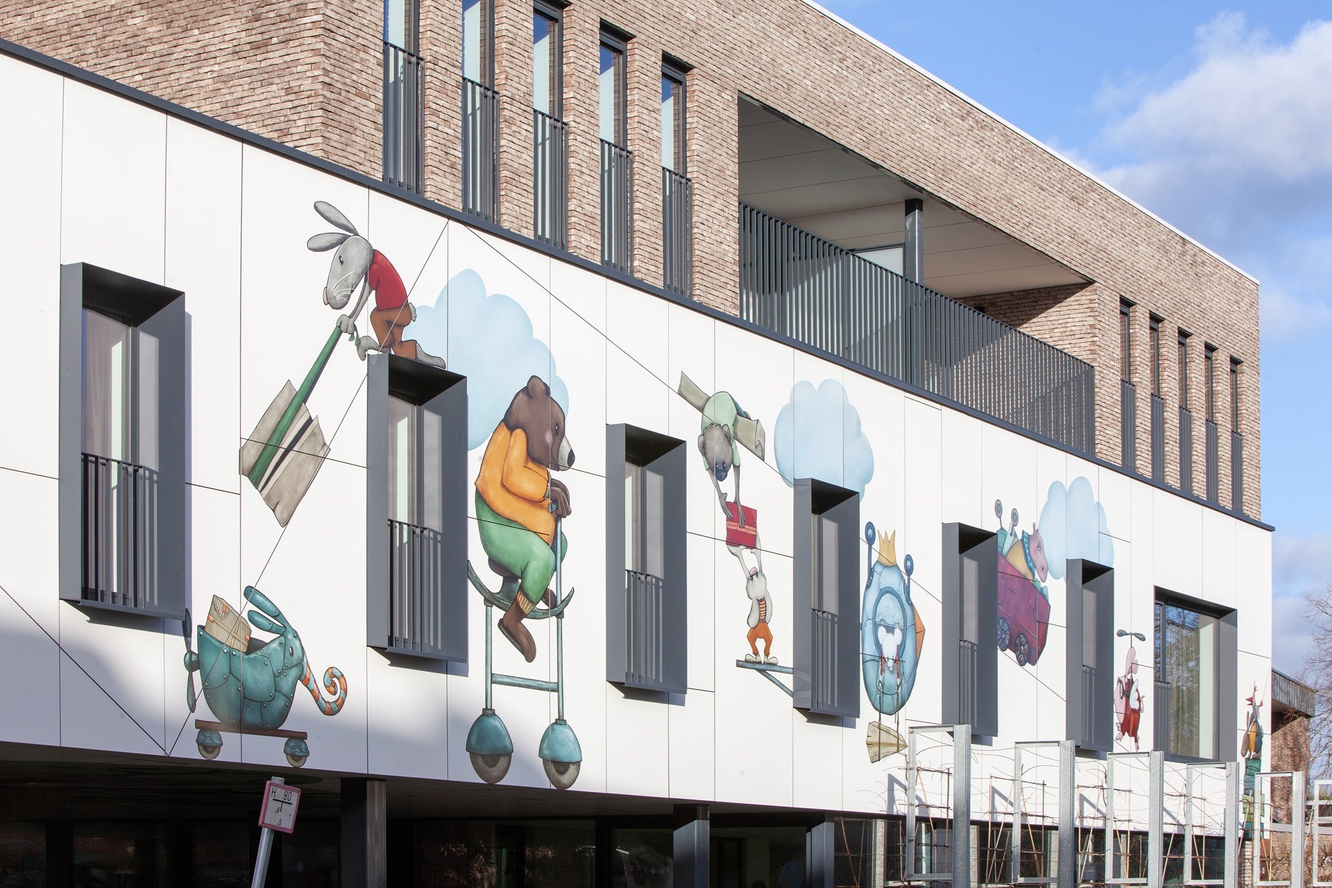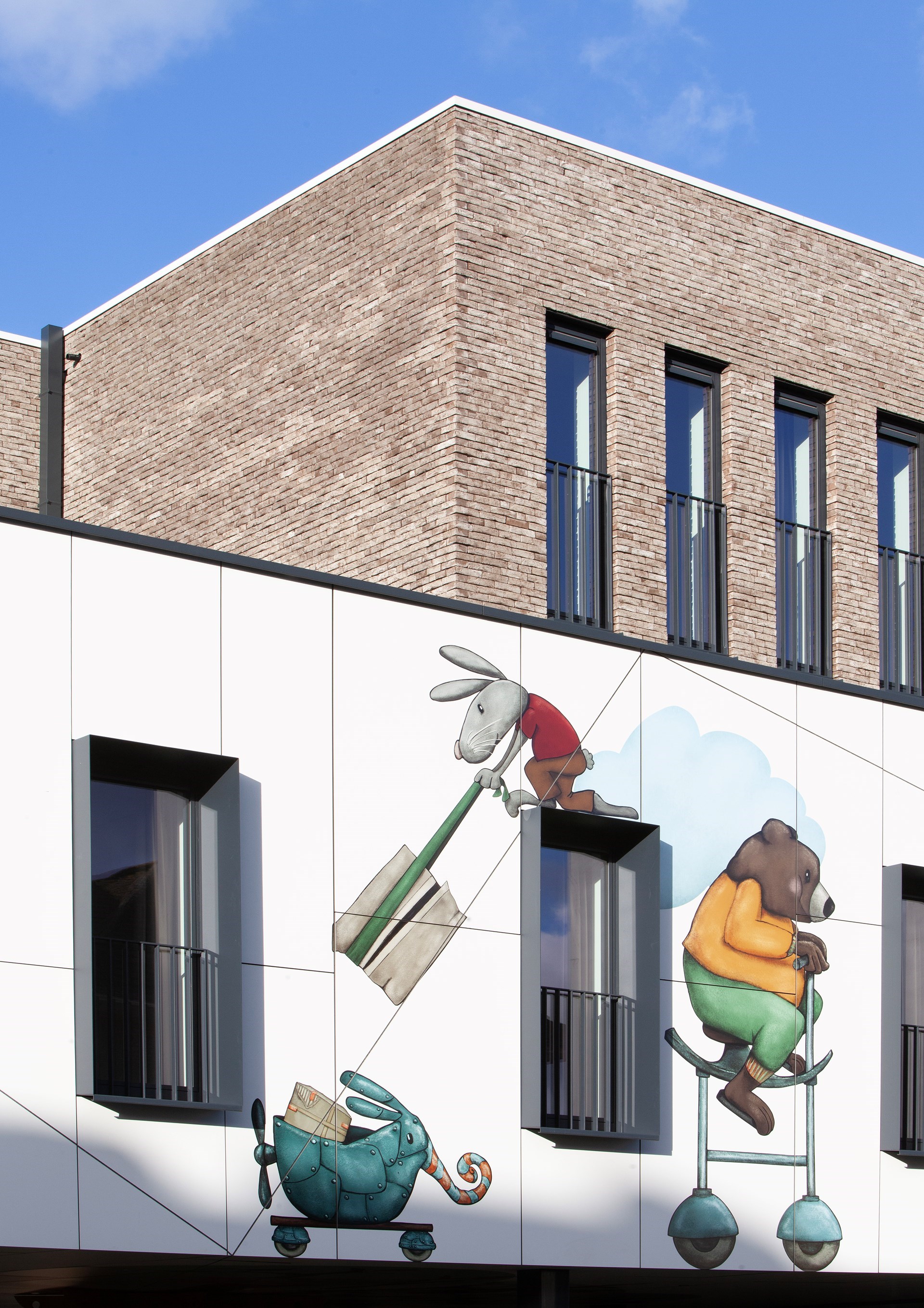 Hubert: “De gewenste kunstintegratie bracht ons tot bij Jolanda Swennen, die prachtige illustraties heeft gemaakt. Centraal staan verschillende fictieve diertjes, elk ook met eigen rugzakje, die het gebouw tot leven brengen en de kinderen eveneens kunnen aanmoedigen hun verhaal te vertellen.”
