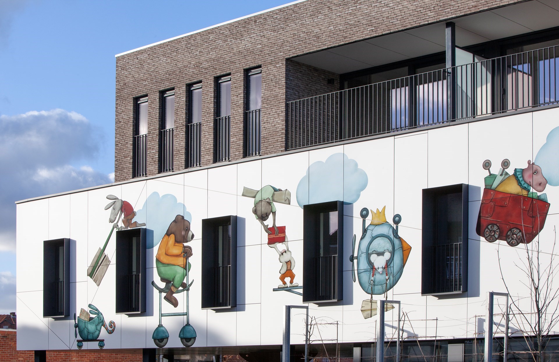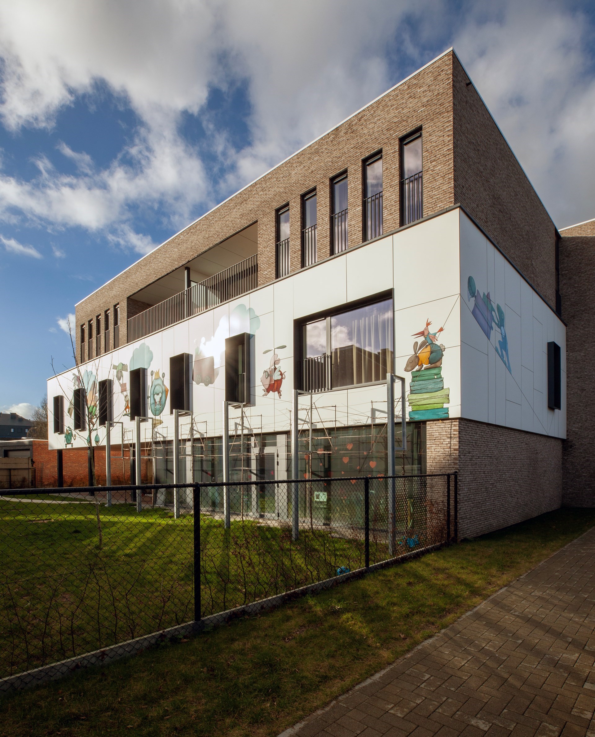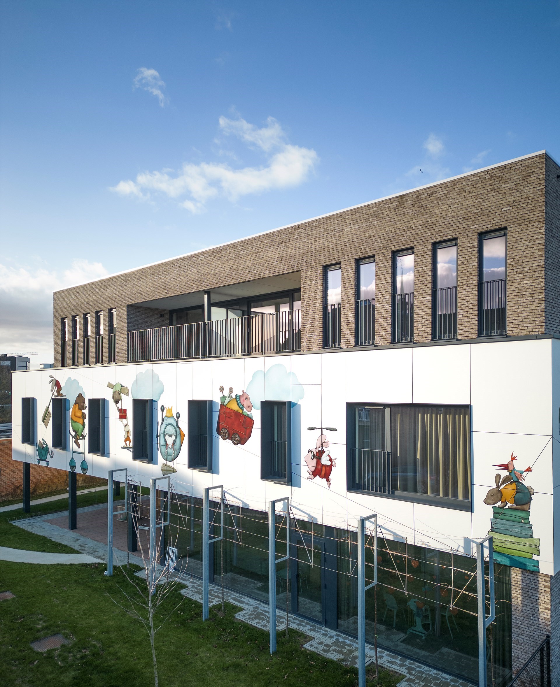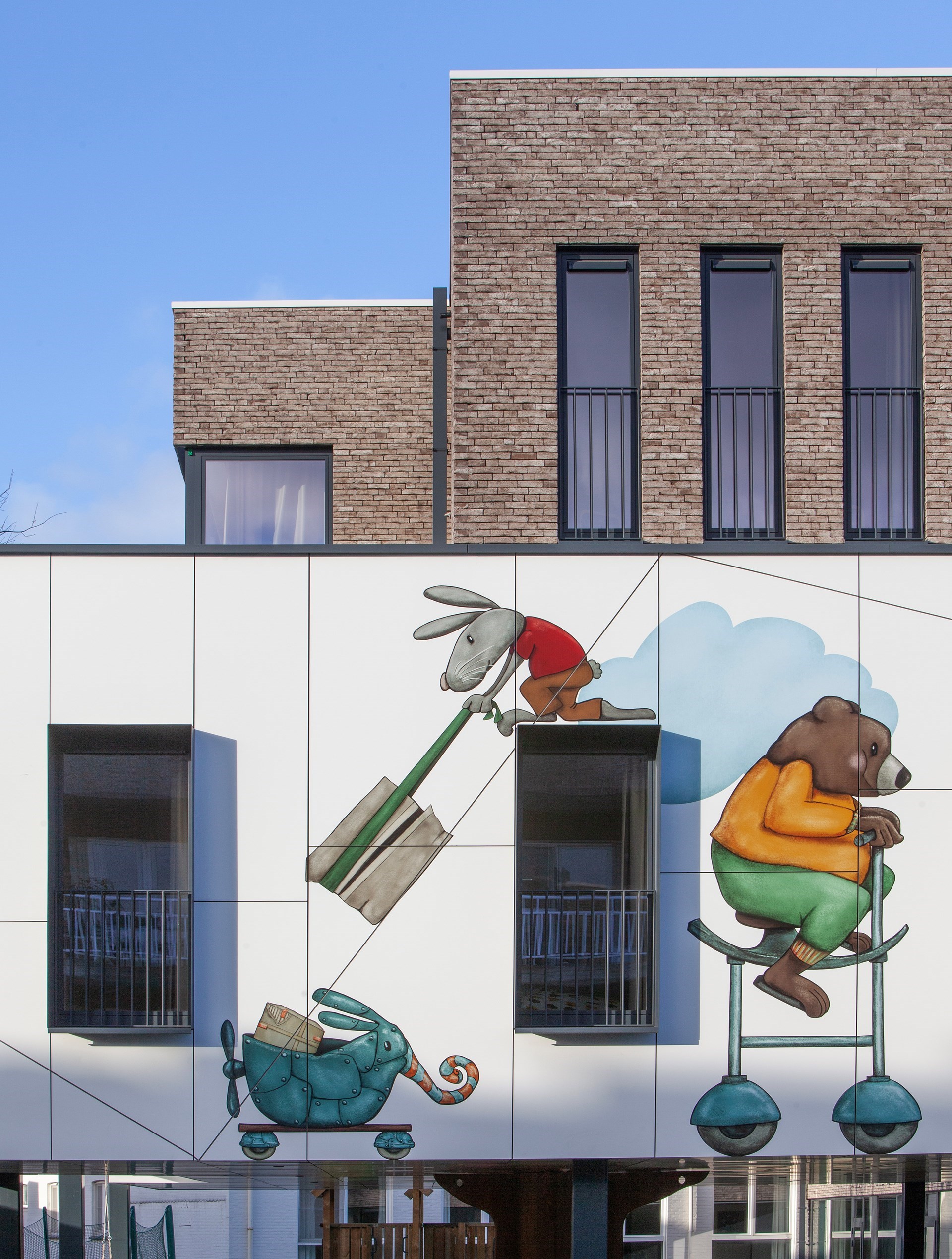 Hubert: “De gewenste kunstintegratie bracht ons tot bij Jolanda Swennen, die prachtige illustraties heeft gemaakt. Centraal staan verschillende fictieve diertjes, elk ook met eigen rugzakje, die het gebouw tot leven brengen en de kinderen eveneens kunnen aanmoedigen hun verhaal te vertellen.”