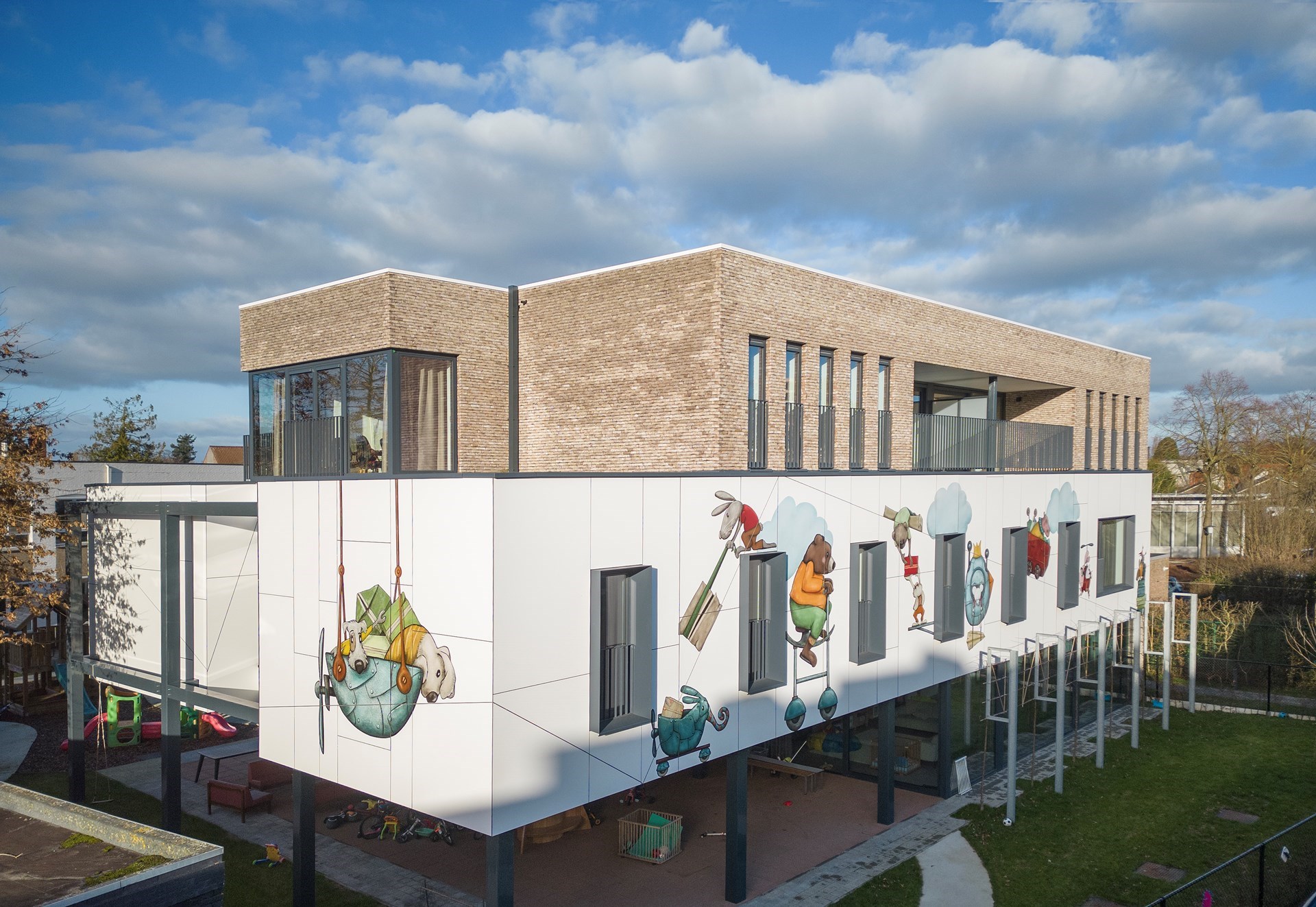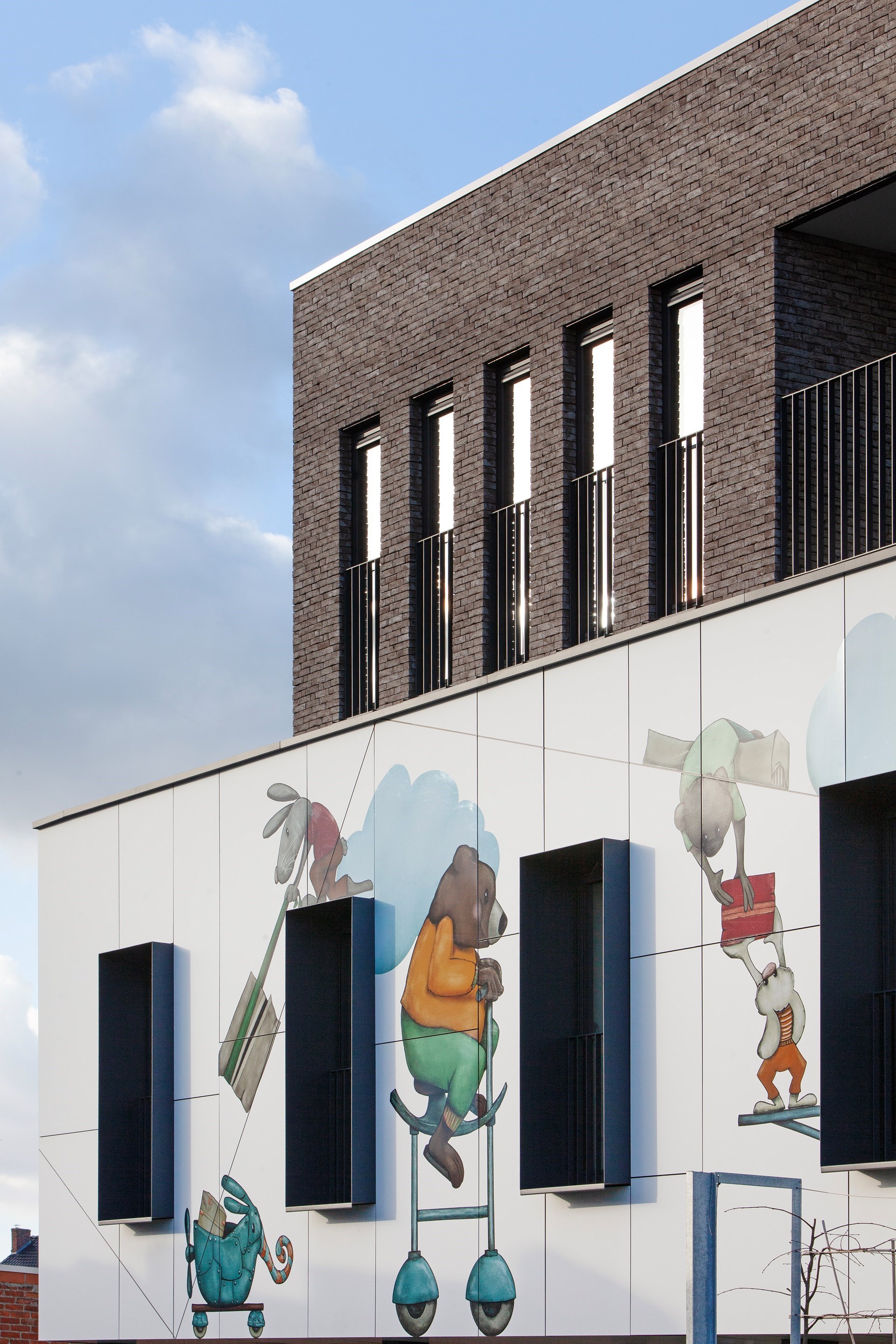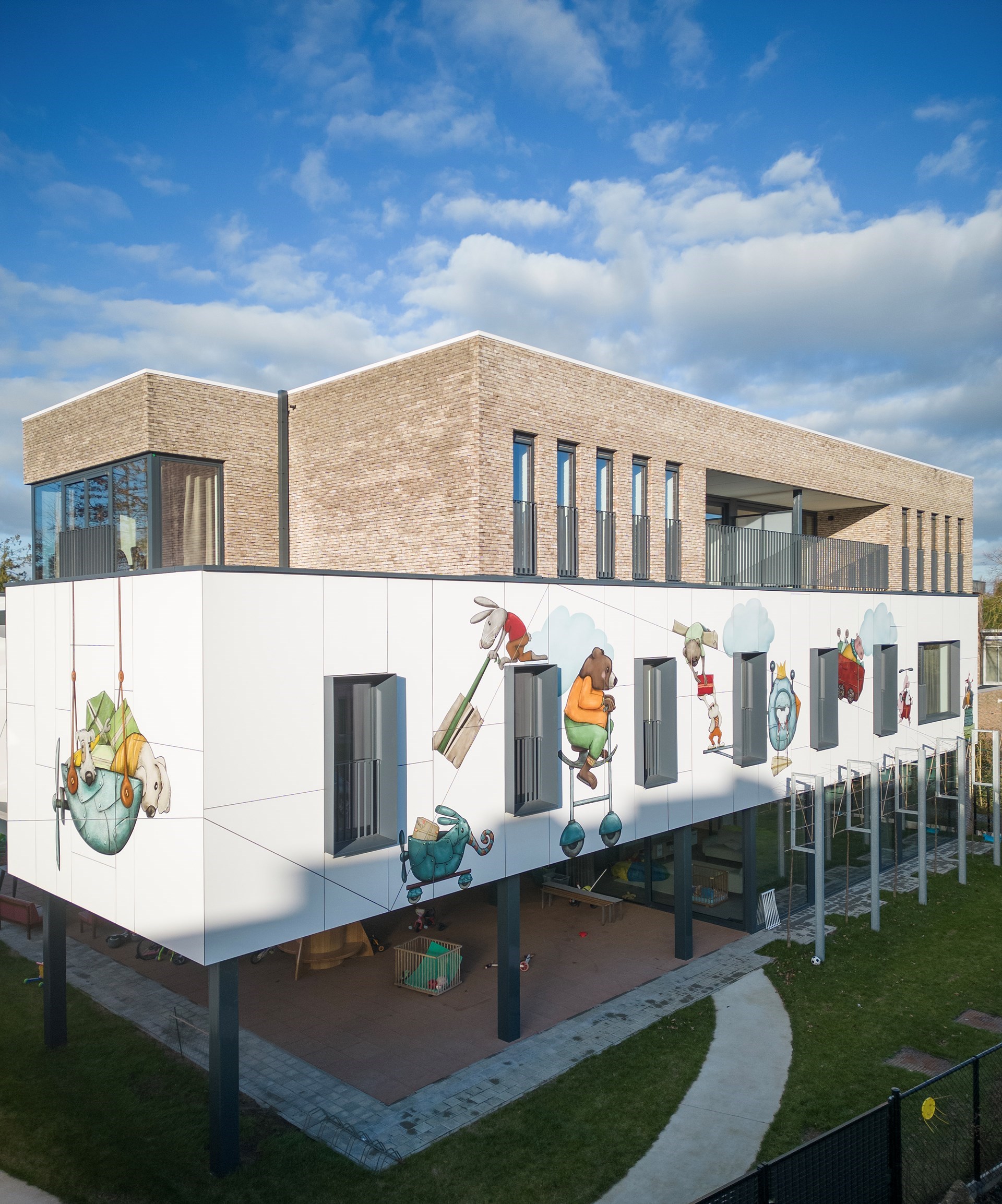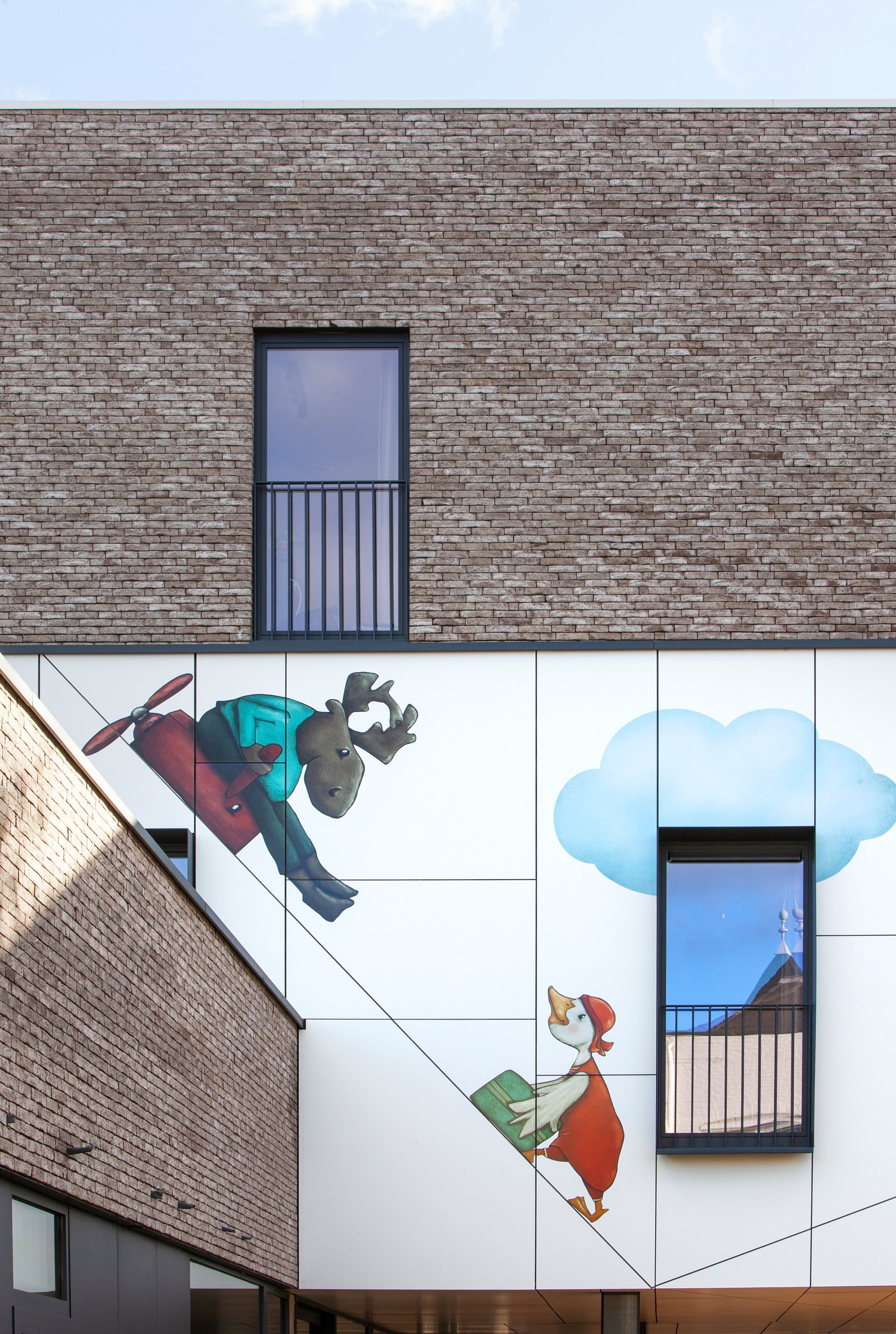 Hubert: “De gewenste kunstintegratie bracht ons tot bij Jolanda Swennen, die prachtige illustraties heeft gemaakt. Centraal staan verschillende fictieve diertjes, elk ook met eigen rugzakje, die het gebouw tot leven brengen en de kinderen eveneens kunnen aanmoedigen hun verhaal te vertellen.”