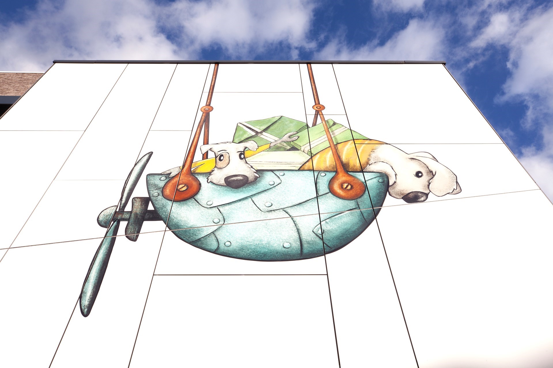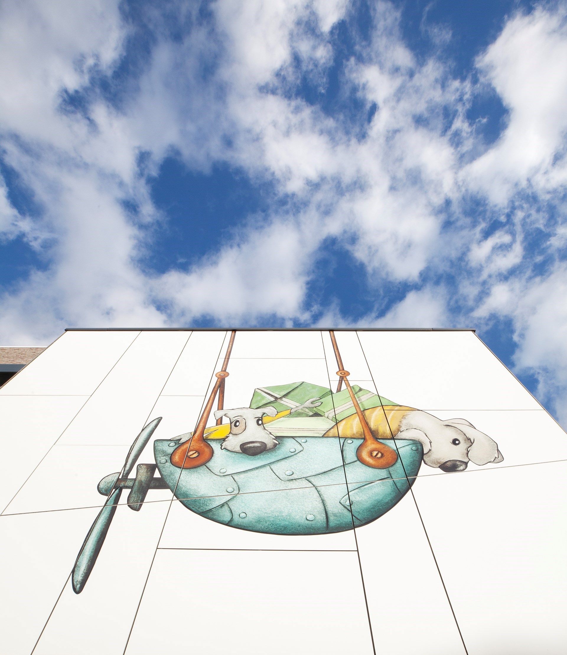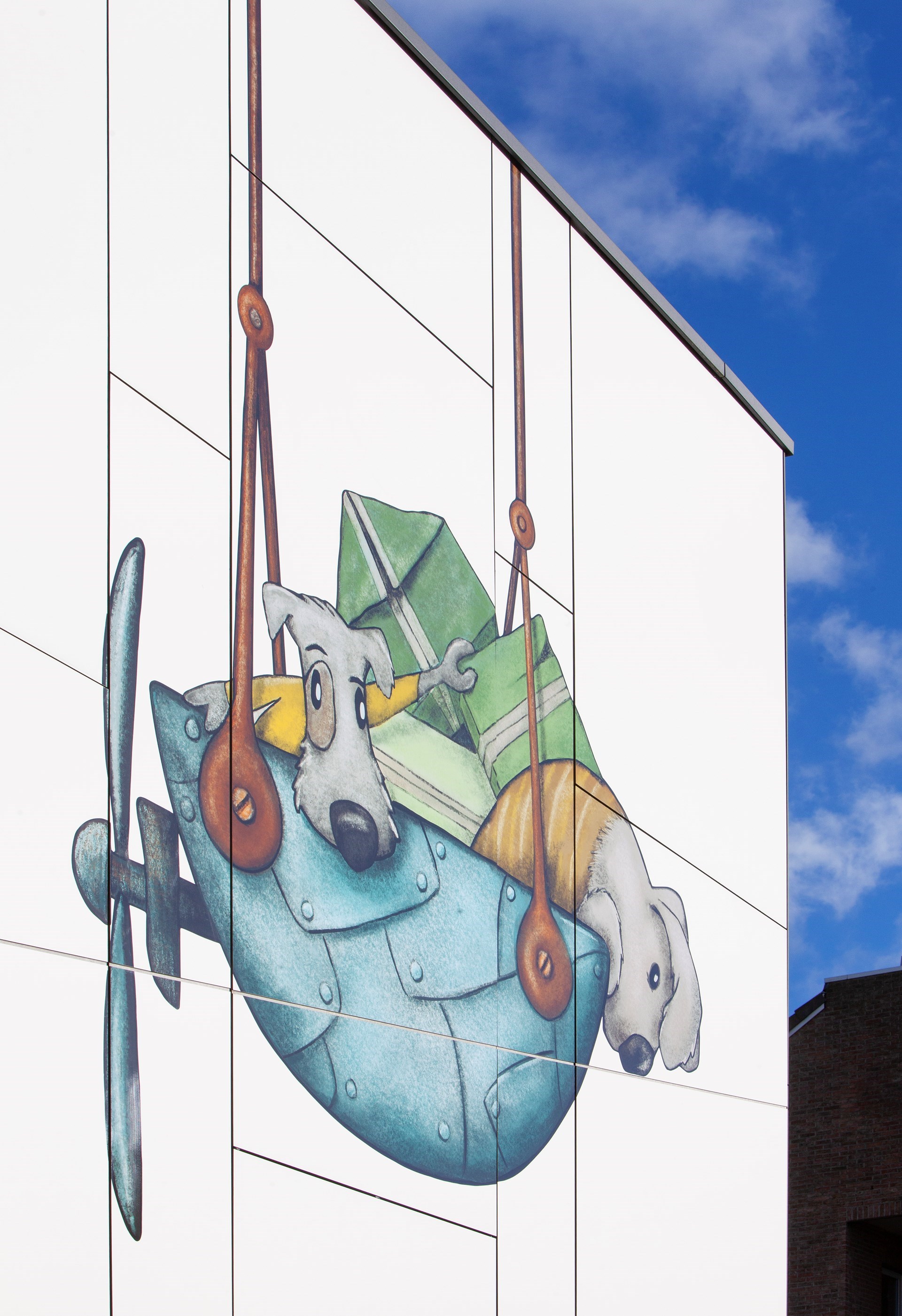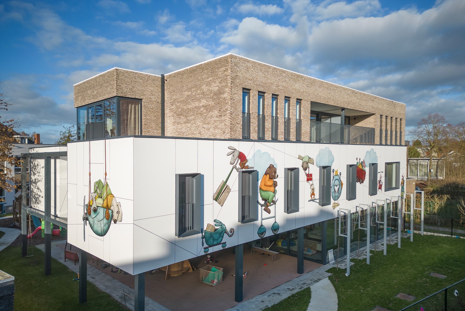 Hubert: “De gewenste kunstintegratie bracht ons tot bij Jolanda Swennen, die prachtige illustraties heeft gemaakt. Centraal staan verschillende fictieve diertjes, elk ook met eigen rugzakje, die het gebouw tot leven brengen en de kinderen eveneens kunnen aanmoedigen hun verhaal te vertellen.”