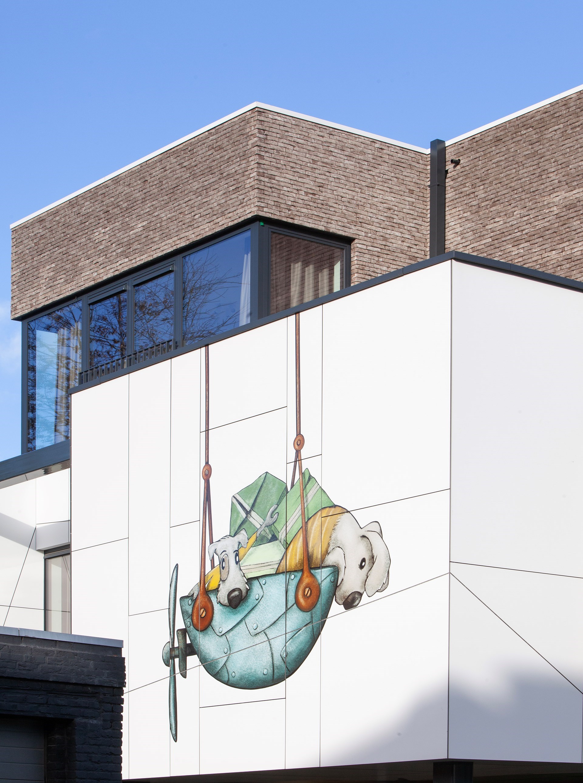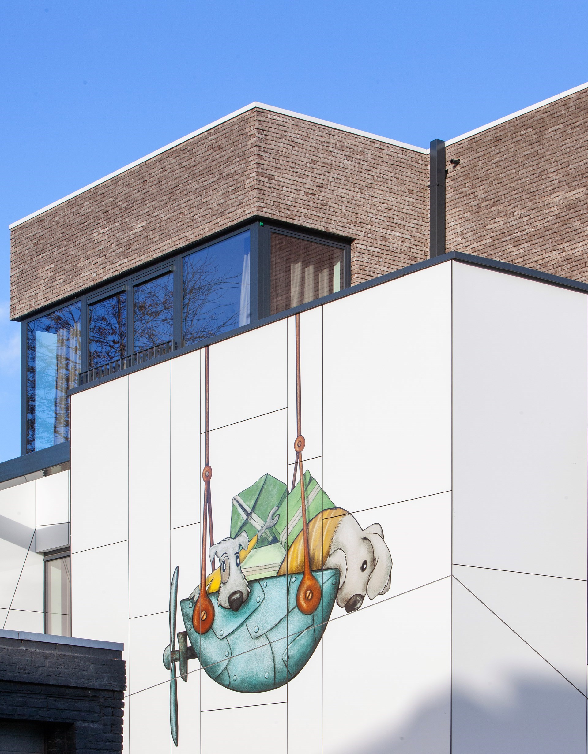 De eerste kennismaking met deze diertjes is al meteen op de gevelbekleding die de eerste verdieping met slaapkamers omsluit. De architect zocht en vond gevelplaten die als een mat wit blad papier zijn en waarop de illustraties tot hun recht konden komen. De keuze viel op de Trespa-gevelplaten, als een eigentijdse puzzel met krachtig lijnenspel, gemonteerd op aluminium regelwerk. De illustraties werden in de vorm van stickers aangebracht. “Het ontwerp en de gevelbekleding, met al zijn technische voordelen, draagt hier bovendien bij tot een doel en heeft zichzelf hierdoor overstegen”, aldus nog de architect. Opzet geslaagd.