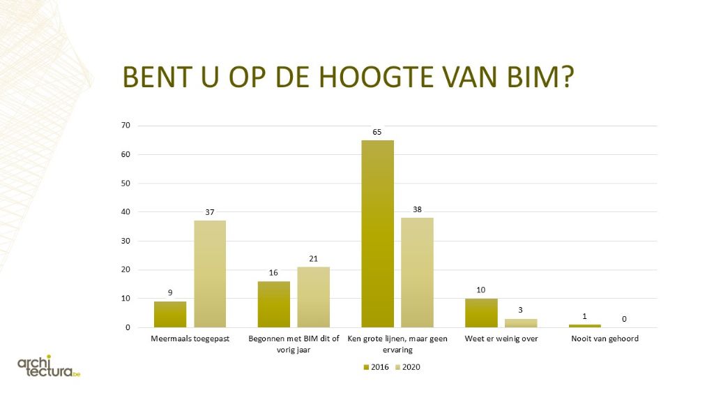 4 jaar geleden bevestigde de enquête dat Belgische architecten inzake BIM-kennis achterop hinken ten opzichte van andere landen. Slechts 19% van de Nederlandstalige architecten had al eens gebimd. Aan Franstalige kant lagen die cijfers nog lager.