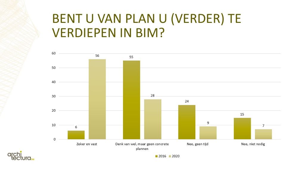 4 jaar geleden hield Redactiebureau Palindroom een soortgelijke enquête. Door de cijfers van 2016 en 2020 met elkaar te vergelijken was het mogelijk om de evolutie van BIM na te gaan. En die evolutie is er zeker.