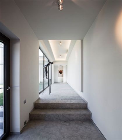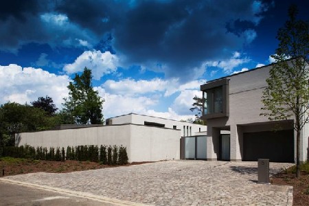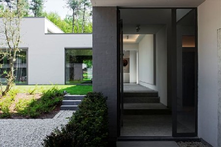 Interieurarchitect Vittorio Simoni verwierf onlangs de titel van architect. Zijn eerste woning als architect vormt meteen een referentie. Inspelend op de oriëntatie (het het zuiden nagenoeg vooraan) ontwierp hij een hedendaagse vierkantshoeve met een breed garagevolume als buffer naar de straat. Op vraag van de bewoners werd de woning ingevuld met een doorgedreven isolatie, seizoensglas, balansventilatie, een warmtepomp met plafond- en vloerverwarming, een Scandinavische buis en weldra ook thermische en fotovoltaïsche zonnepanelen.
