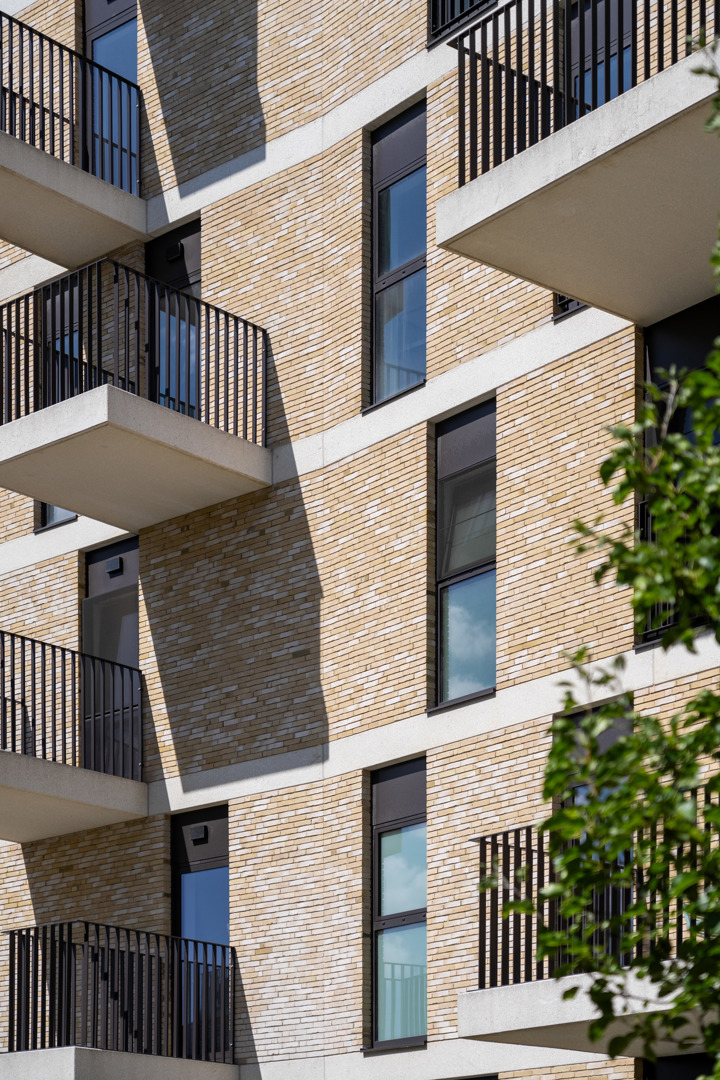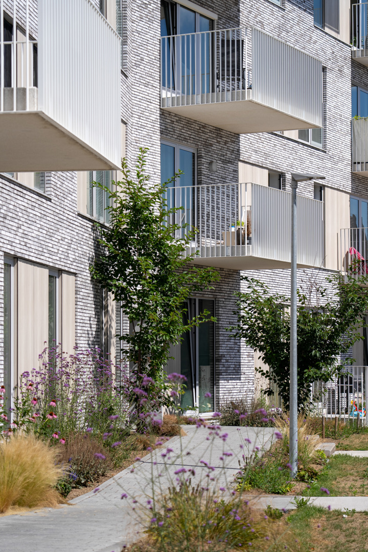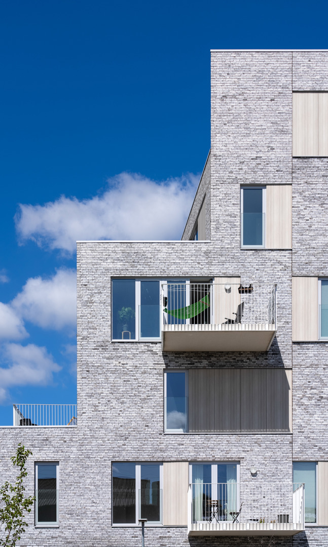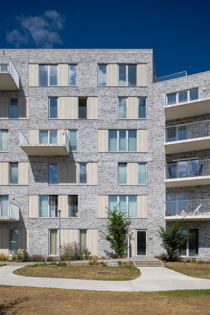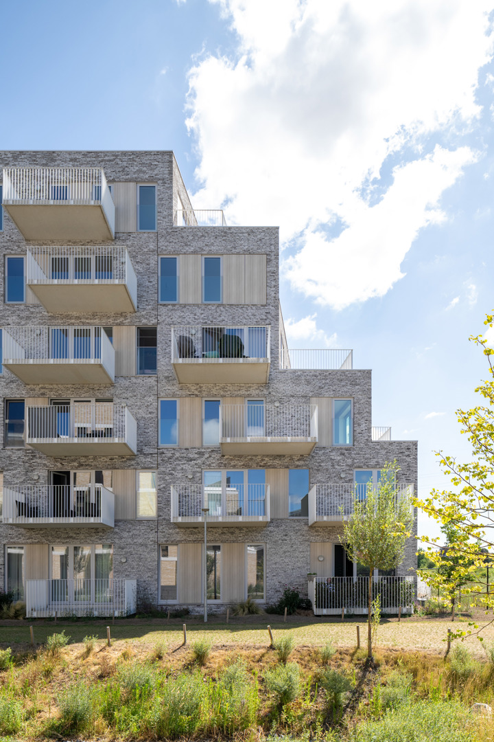 De architectuur is zorgvuldig afgestemd op zowel de schaal van de omgeving als de eigenheid van de site. Aan de straatzijde beperken de volumes zich tot vier bouwlagen om aan te sluiten bij het kleinschalige karakter van de Kerklaan. Richting het groene binnengebied nemen de gebouwen stapsgewijs in hoogte toe, met getrapte, zuidgerichte terrassen die voor overvloedig daglicht en fraaie zichten zorgen. Elk gebouw kreeg een herkenbare gevelidentiteit, met variaties zoals geschrankte uitsparingen, horizontale gelaagdheid of een strak metselwerkraster in natuurlijke baksteen voor een tijdloze uitstraling.