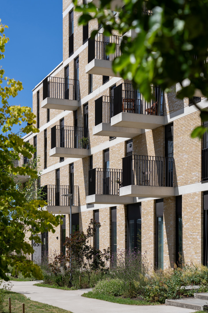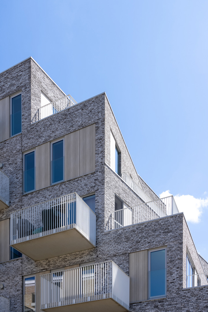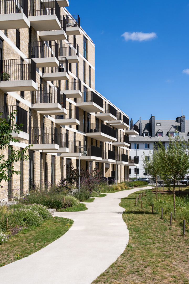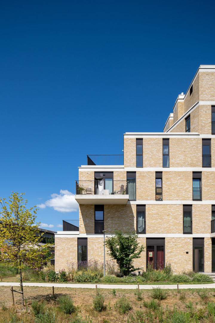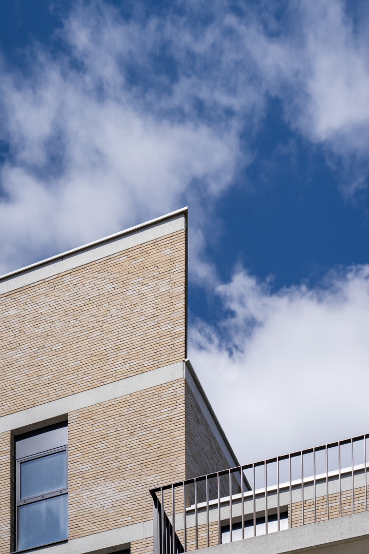 De architectuur is zorgvuldig afgestemd op zowel de schaal van de omgeving als de eigenheid van de site. Aan de straatzijde beperken de volumes zich tot vier bouwlagen om aan te sluiten bij het kleinschalige karakter van de Kerklaan. Richting het groene binnengebied nemen de gebouwen stapsgewijs in hoogte toe, met getrapte, zuidgerichte terrassen die voor overvloedig daglicht en fraaie zichten zorgen. Elk gebouw kreeg een herkenbare gevelidentiteit, met variaties zoals geschrankte uitsparingen, horizontale gelaagdheid of een strak metselwerkraster in natuurlijke baksteen voor een tijdloze uitstraling.