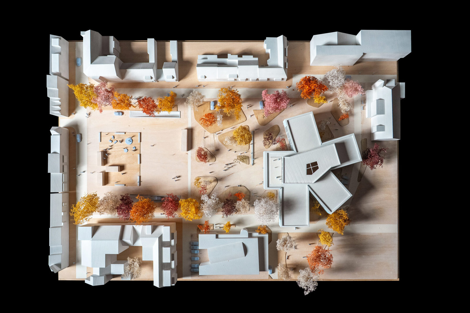 Ook landschappelijk wordt ingezet op samenhang. In het ontwerp van OKRA landschapsarchitecten wordt het omliggende duinlandschap doorgetrokken in het nieuwe ontwikkelingsgebied, met aandacht voor ontharding, vergroening en biodiversiteit. Zo ontstaat een geleidelijke overgang tussen plein en gebouw, waarin architectuur en buitenruimte elkaar versterken.