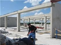Jo Stallaert staat eerst even stil bij de toegepaste verbindingen voor het parkeerniveau. “Op de buitenassen werd in het parkeerniveau veelvuldig gebruik gemaakt van het BSF-systeem, ofwel de verdoken console. De balk-kolomverbinding gebeurt hierbij met behulp van een stalen plaat die uit de balk geschoven kan worden in een inkeping in een kolom. Na de plaatsing worden voegen tussen balk en kolom opgegoten met krimparme mortel, zodat de verbinding ook weerstand biedt aan brand.”