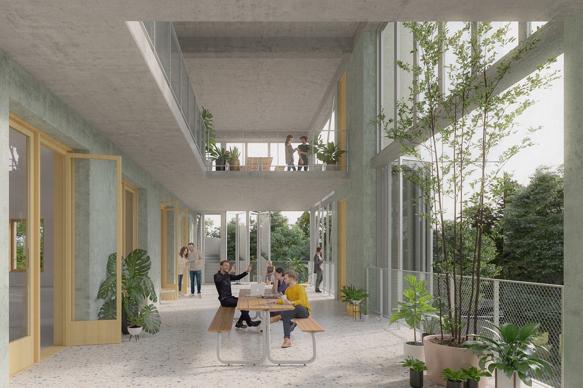 Volgens de jury is dit project een schoolvoorbeeld van hoe bouwen er in de toekomst uit kan zien. “Het flexibele ruimtegebruik waar in de toekomst andere invullingen mogelijk zijn, is zeker het sterkste punt van dit project”, staat te lezen in het juryverslag. “Het gebouw is future proof en veranderingsgericht. Hoewel het nog in conceptfase zat, werden verschillende scenario’s voor de invulling van het aanpasbare plan effectief getest én ze zijn geloofwaardig.” Dat trappen en liften die normaal in een vaste kern zitten hier naar de buitenkant verhuizen is architecturaal heel origineel en zinvol volgens de jury. “Door die ingreep is er binnen immers nog meer flexibiliteit. Ook aan de buitenzijde werkt dit wel en heeft het een mooi visueel effect. Waar eenvormigheid op de verdiepingen vaak leidt tot een eentonige look, zit hier toch een boeiende variatie in de structuur en ziet het er architecturaal heel aantrekkelijk uit.” “Dit project is ook interessant op het vlak van materiaalgebruik met lokaal geproduceerde, demontabele kleipannen en vlasisolatie, die een knipoog is naar de rijke vlasgeschiedenis in de regio. Alle aspecten van circulariteit komen hier op een geloofwaardige manier aan bod. Het gebouw bewijst ten slotte ook dat circulariteit niet beperkend moet zijn op het vlak van architectuur.”