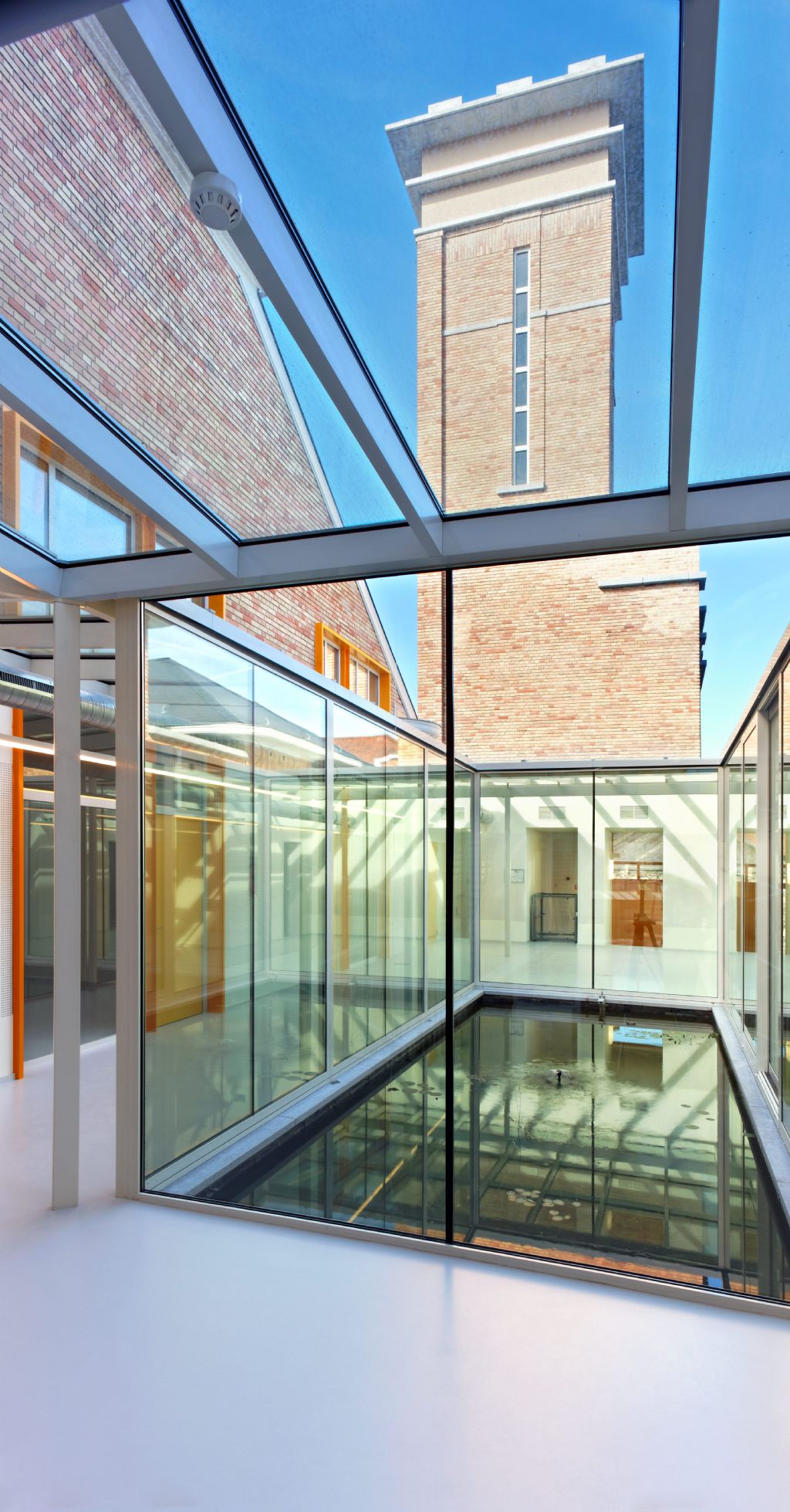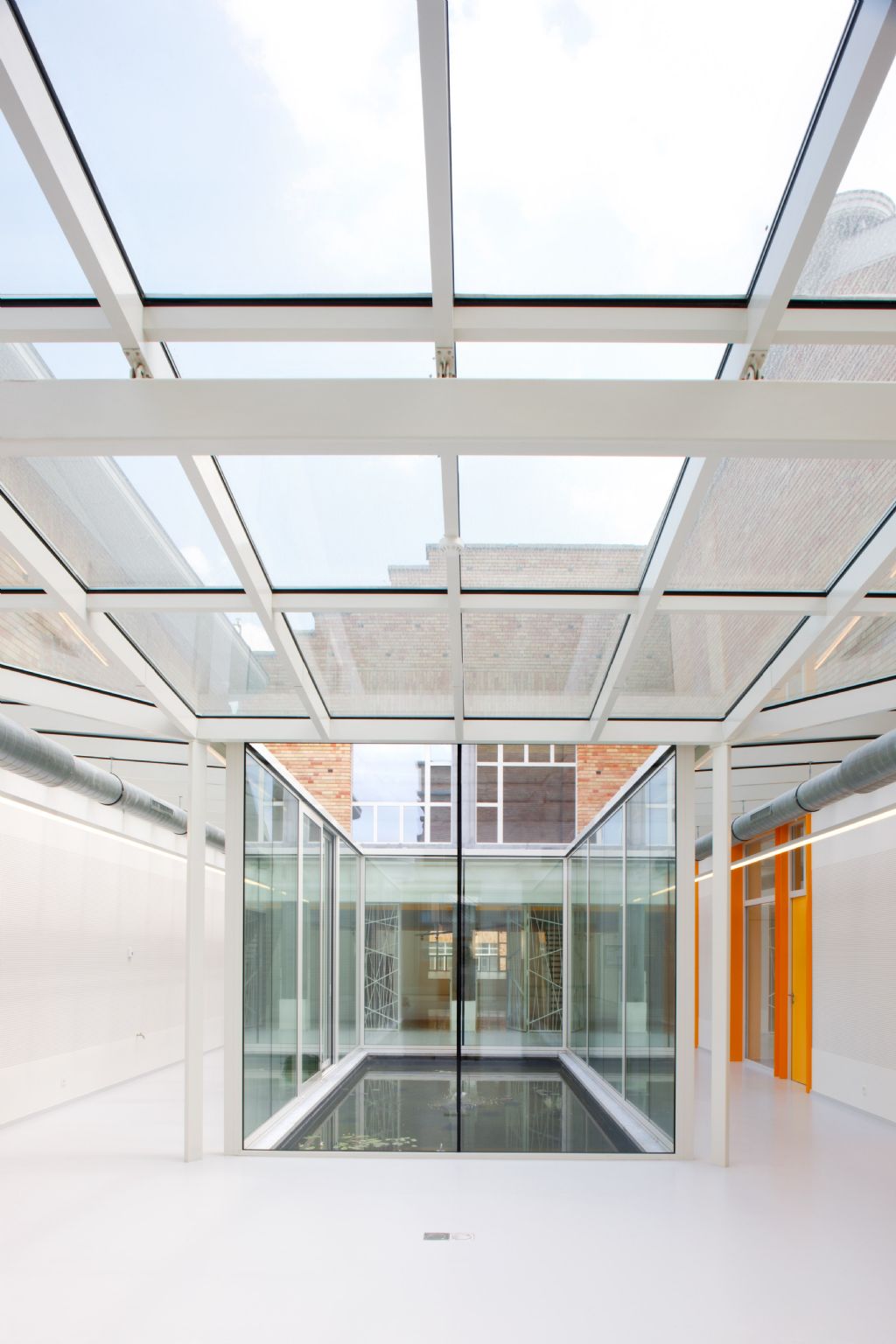 De structuur van het platte dak is gebruikt voor alle hedendaagse delen van de renovatie. Zo zijn oud en nieuw relatief makkelijk van elkaar te onderscheiden en is het complex eenvoudig te ‘lezen’.
