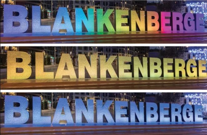 De echte eyecatcher van het project? Dat is zonder twijfel het werk van kunstenares Kaat Van der Marliere: gigantische letters versierd met haar bekende figuurtjes vormen de naam Blankenberge.
