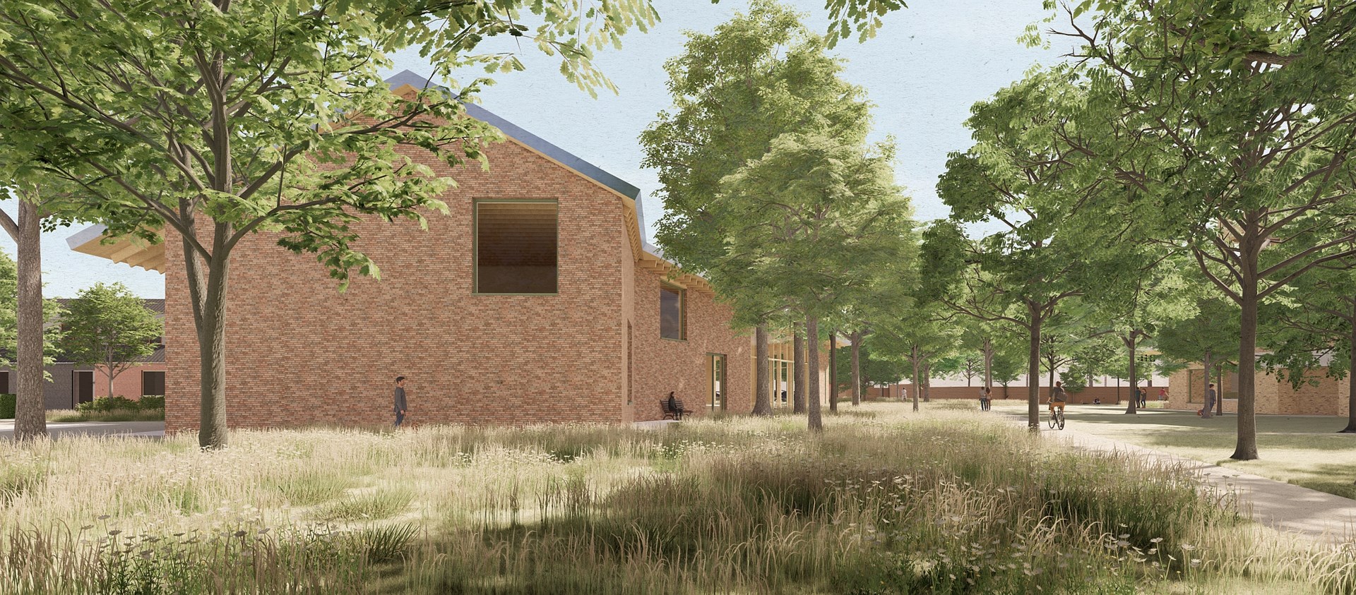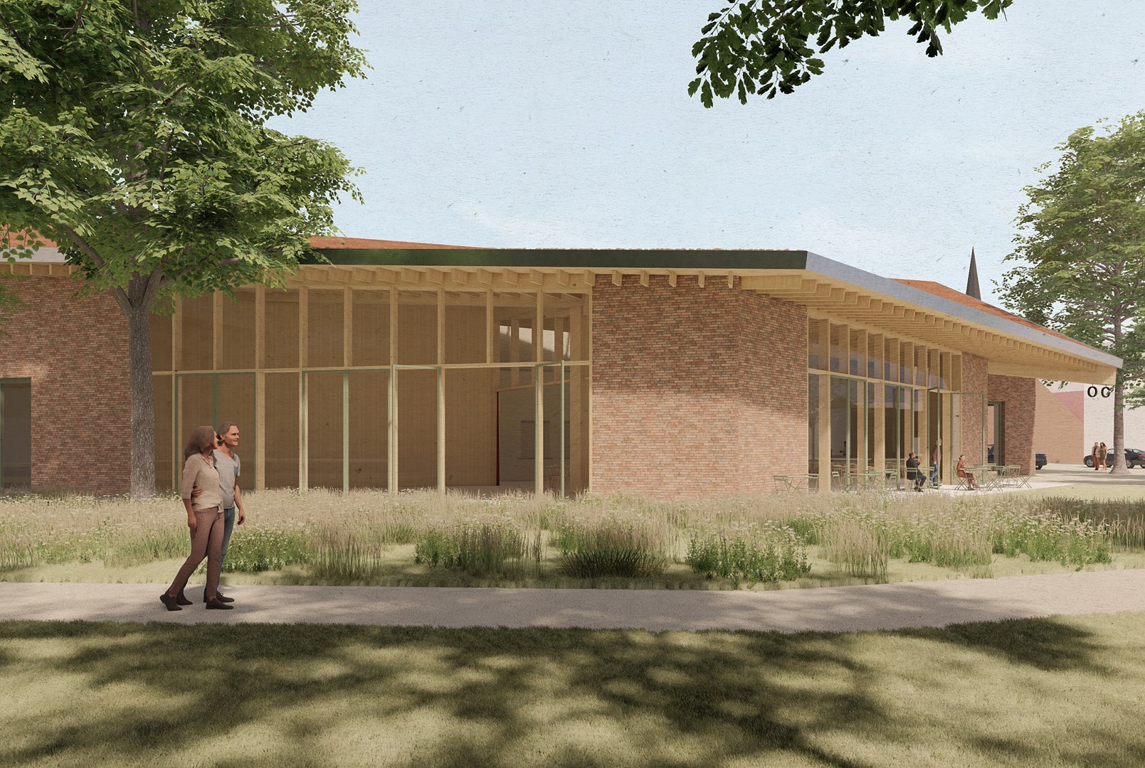 Het nieuwe cultuurhuis wordt strategisch geplaatst om de bestaande verhoudingen op de site te behouden en te versterken. In plaats van een dominant volume wordt het een dorpshuis met een open en uitnodigende identiteit. De toegang aan de Hoogstraat speelt een belangrijke rol in het ontwerp en zorgt ervoor dat het gebouw zich naar het dorp opent. Door de gevels aan drie zijden open te maken, ontstaat een synergie tussen het cultuurhuis, het cultuurplein en het park. De vormgeving en materiaalkeuze dragen bij aan de integratie in de omgeving. De gevels bestaan uit warme, natuurlijke materialen zoals hout en baksteen, waardoor het gebouw een tijdloze uitstraling krijgt en een huiselijk gevoel uitstraalt.