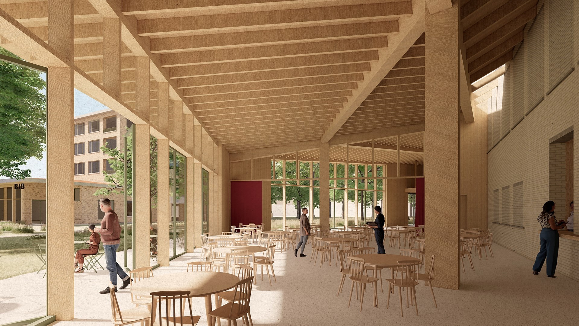 Duurzaamheid staat centraal in het ontwerp. Adj en BLAUWDRUK Stedenbouw hanteren een circulaire benadering, waarbij bestaande structuren en materialen zo veel mogelijk worden hergebruikt. De bestaande verharding op het plein wordt gerecupereerd, en ook binnen het gebouw blijft een groot deel van de bestaande structuur behouden. Hierdoor blijft de geschiedenis van de plek voelbaar, terwijl de gebouwen een nieuwe, hedendaagse invulling krijgen. De constructie van de theaterzaal wordt volledig in hout gerealiseerd, wat niet alleen ecologisch verantwoord is, maar ook bijdraagt aan een aangename akoestiek en een warme uitstraling.