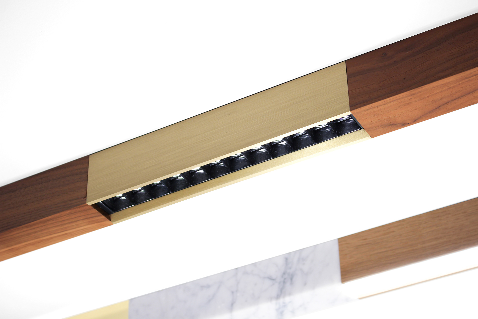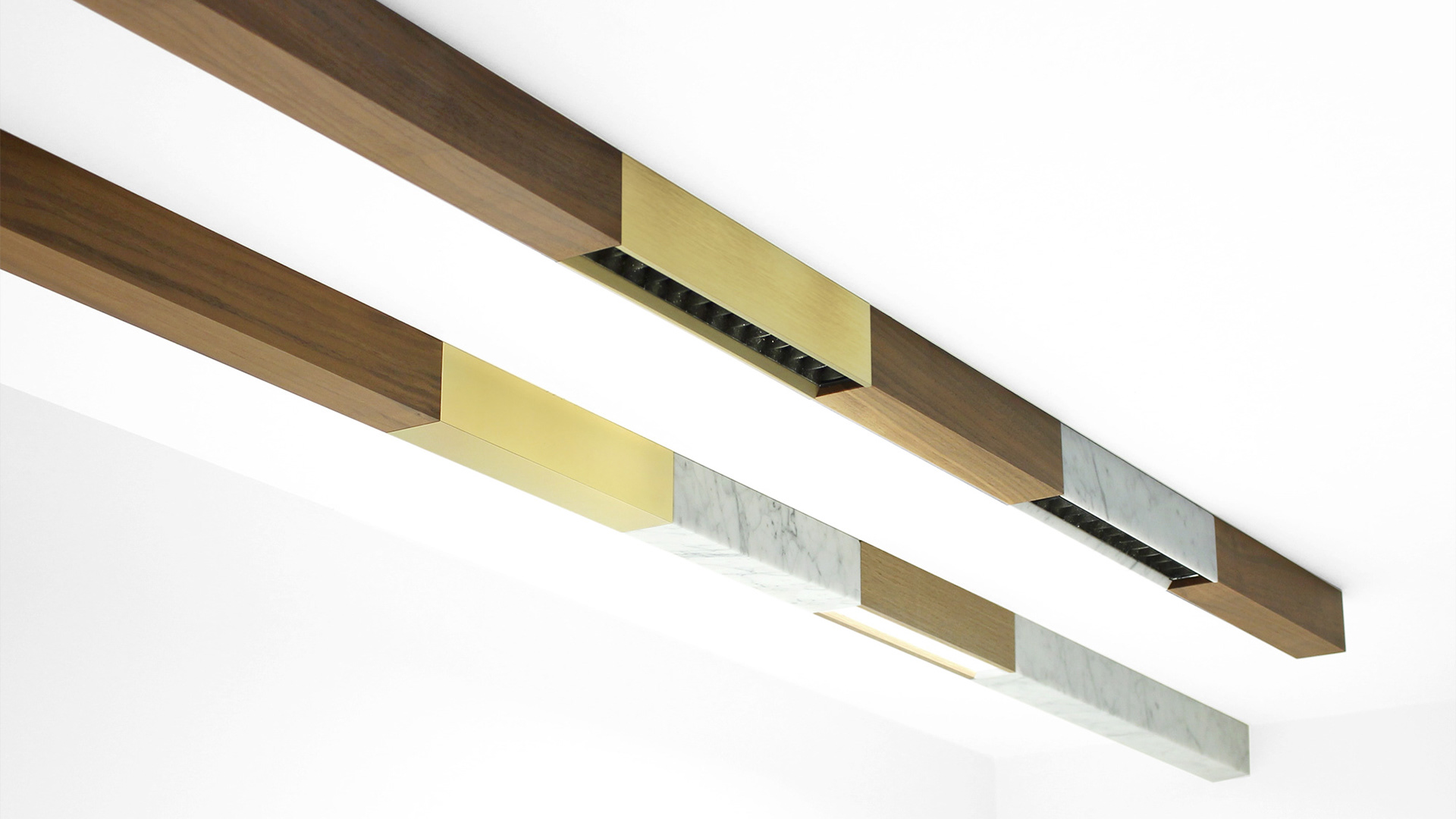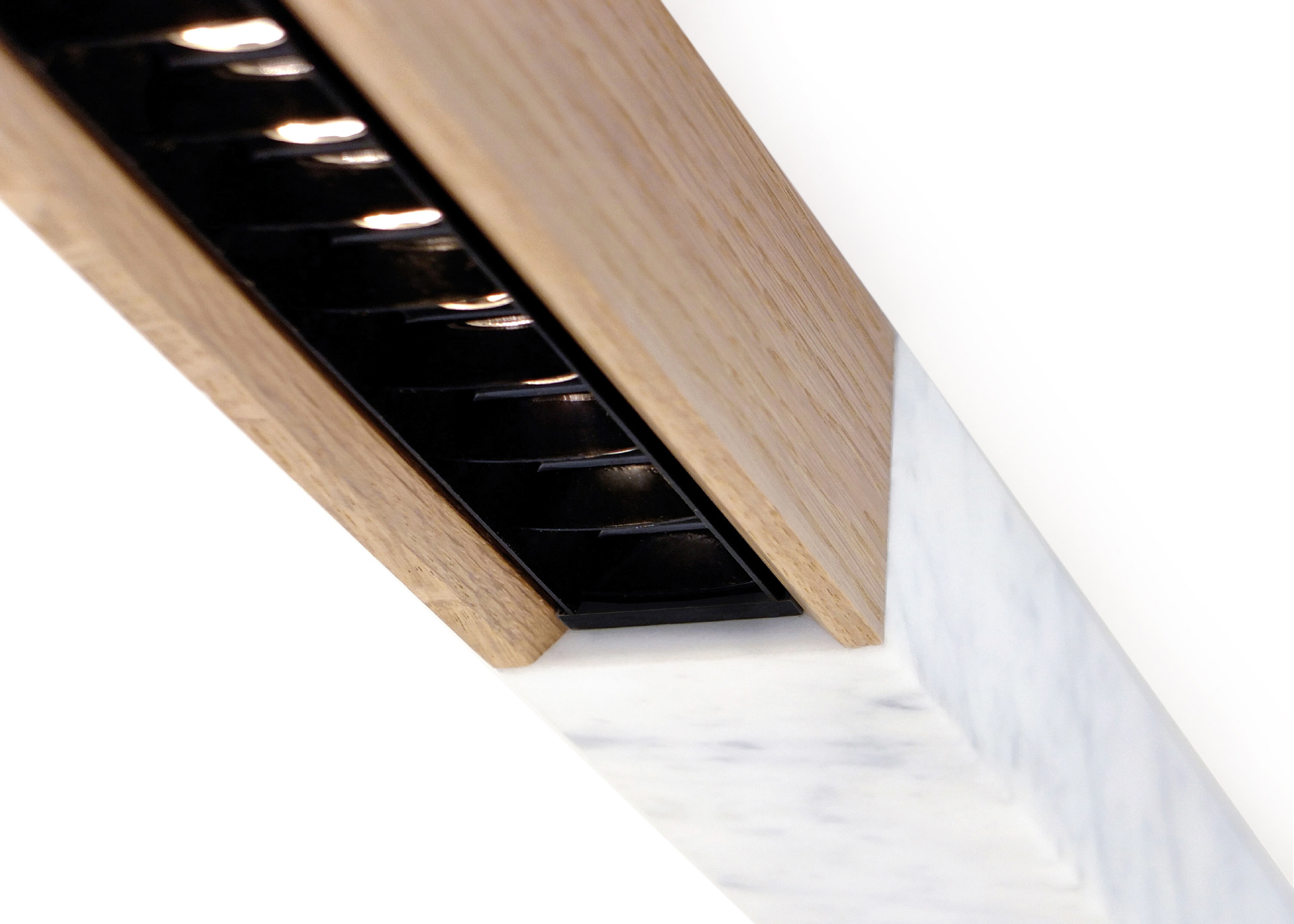De ogenschijnlijk eenvoudige vorm van de lampen is zowel complex als verfijnd. Het frezen van de marmeren onderdelen bijvoorbeeld werd met uiterste precisie gedaan met een standaard, die je normaal van metaalwerk verwacht. Om elektriciteit naar de verschillende verlichtingsarmaturen te krijgen, koos de fabrikant dan weer voor een standaardrail. De blokken uit verschillende materialen kunnen aan die rail bevestigd worden met clips of adapters.