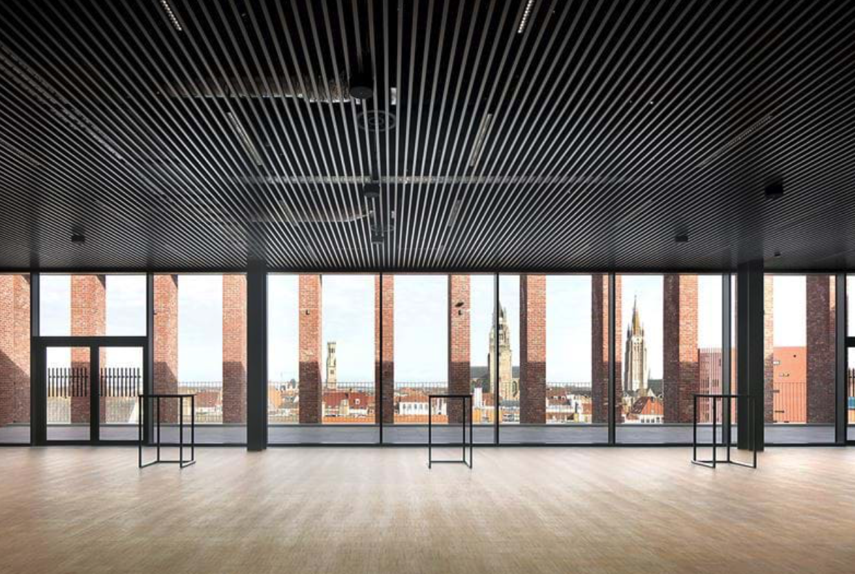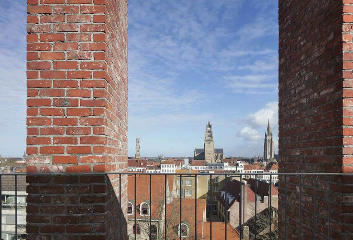 Met kwaliteitsvolle architectuur en een passend kleurenpallet past het BMCC zich wonderwel in de omgeving in en toont Brugge dat het niet enkel teert op zijn historisch patrimonium om te excelleren. Beide kunnen elkaar versterken. Het mooiste voorbeeld daarvan vind je op de verdiepingen waar de bakstenen vinnen het zicht van binnen naar buiten sturen en je steeds meer getrakteerd wordt op de Brugse skyline met het dakterras als apotheose. Het BMCC treedt er in dialoog met de drie torens van het Belfort, de Sint-Salvatorskathedraal en de Onze-Lieve-Vrouwekerk, waardoor heden en verleden mooi samenvloeien.