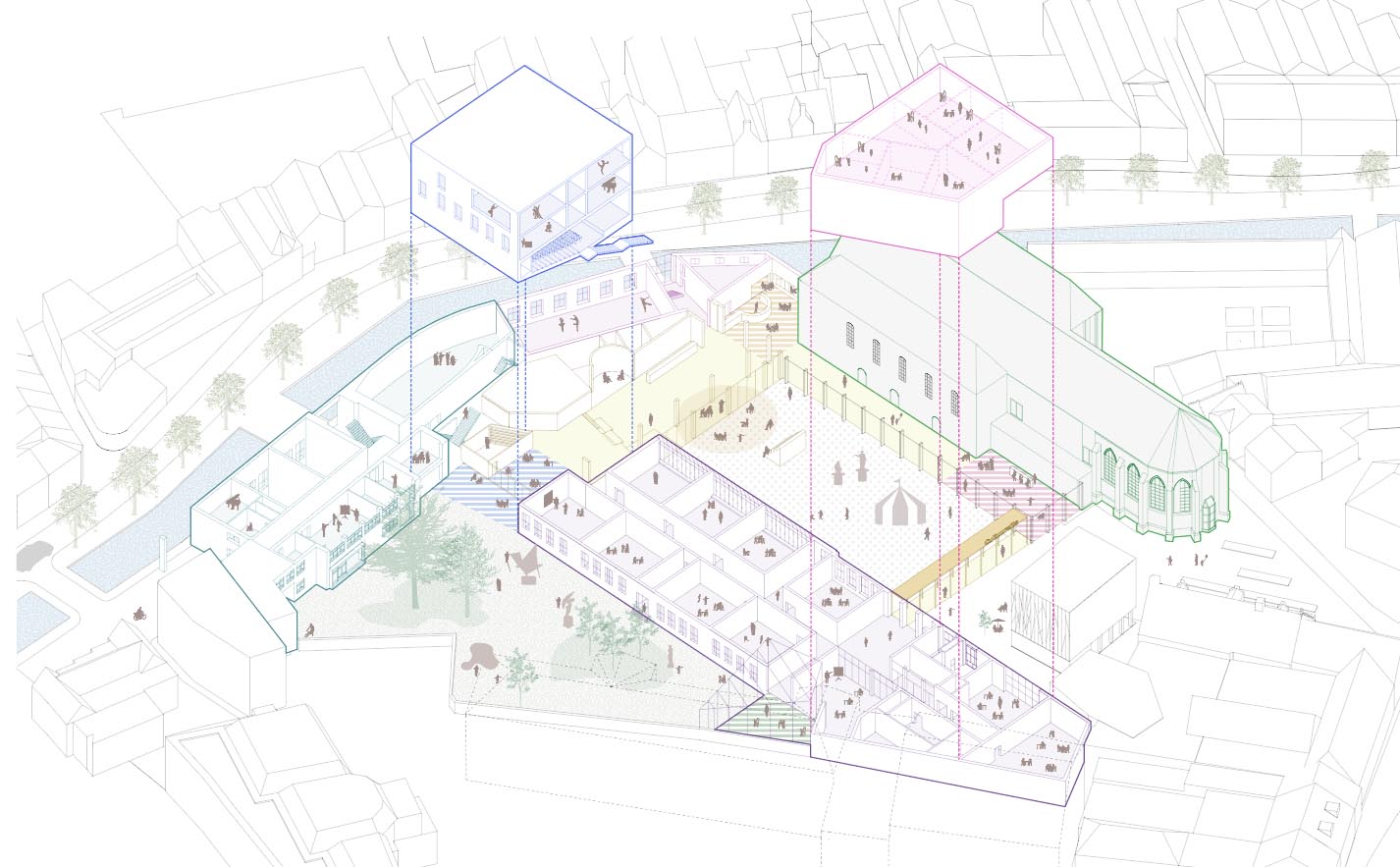 “Door één centrale knoop te ontwarren kan een openbare woonkamer van de cultuursite gecreëerd worden waar kruisbestuiving van alle instellingen mogelijk wordt. Als laagdrempelige kloppend hart verbindt ze, samen met enkele andere ruimtelijke ingrepen, de verschillende waardevolle binnen- en buitenruimtes met elkaar tot een culturele rondgang die het veelzijdige karakter van deze plek recht aan doet en verbindt met de stad”, verduidelijkt Bob De Wispelaere namens Bob McMaster architecten en KRFT.