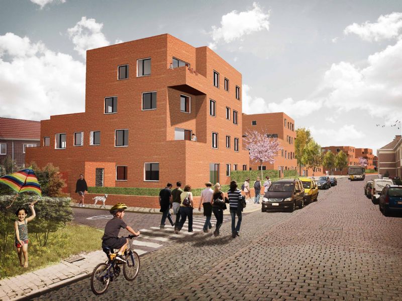 Het bouwprogramma concentreert zich op de twee uiterste hoeken van het perceel. Het middelste gedeelte is hierdoor sterk ontlast. Rode baksteen bepaalt het uitzicht van de appartementen. Omwille van de buurtcohesie hebben deze dezelfde kleur als de omliggende gebouwen. 30% van de woningen is aangepast voor rolstoelgebruik.