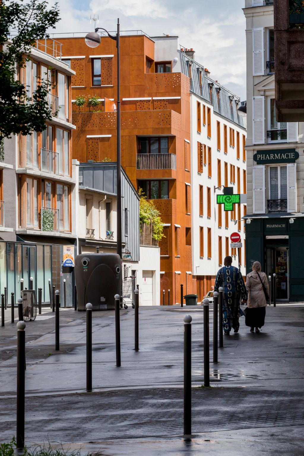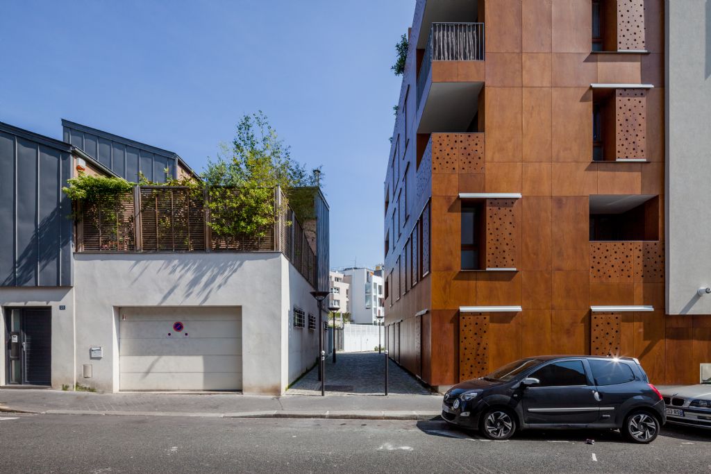 BOB361 laat zich inspireren door de - voor Parijs - typische gelijkvloerse, houten handelsgevels. Het kiest ervoor om deze in een hedendaagse versie in de vorm van houten panelen te gebruiken in de sokkel van het bestaande gerenoveerde gebouw en vervolgens door te trekken bij het nieuwe gebouw. De gevelelelementen functioneren ook als beweegbaar luik, bieden privacy aan de bewoners en dienen als zonwering. Ze zorgen voor een spel van licht en warmte en creëren een welkom gevoel.