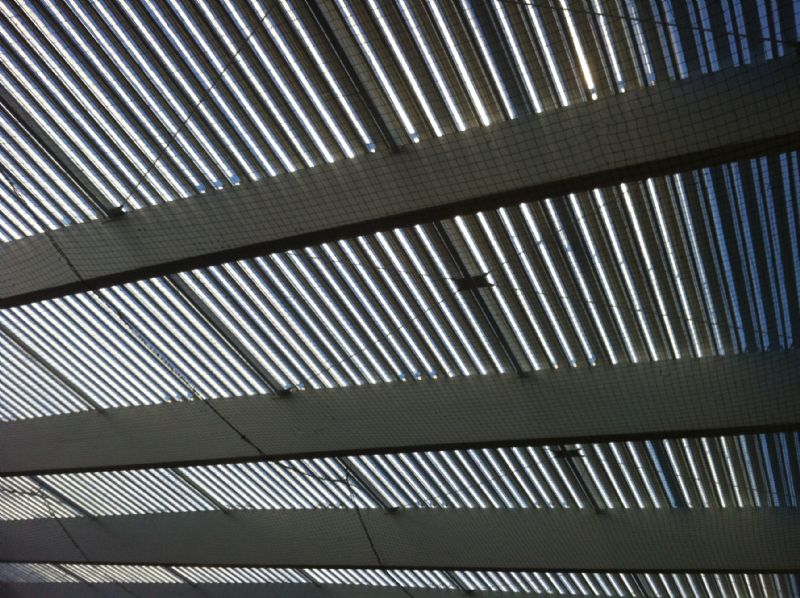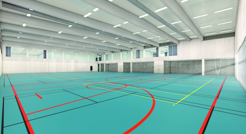 De nieuwe sporthal wordt tegen de loodsen van het naastliggende containerpark gebouwd. Daardoor blijft er voldoende ruimte om het achterliggende natuurgebied vanaf de straatkant te ervaren. OMGEVING: “Het gebouw werd sober ontworpen met aandacht voor zichtrelaties. Een buitenpasserelle op de verdieping vormt een eenvoudige en functionele verbinding tussen de binnen- en buitenruimte.”