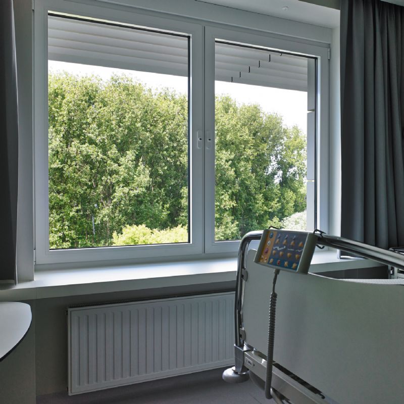 Alle bestaande ramen zijn vervangen door nieuwe systemen met thermisch onderbroken raamprofielen en aangepaste beglazingen. Om de invallende zonnewarmte in de kamers te beperken, kozen de bouwpartners voor luifels met aluminium lamellen (type Icarus van Renson). Aangezien deze luifels boven de ramen hangen, verstoren ze het uitzicht naar buiten niet. Bovendien bieden deze systemen bij hoge stand van de zon tijdens de zomermaanden een goede beschaduwing. Tijdens de wintermaanden laten ze de aangename zonnewarmte in het ziekenhuis binnen schijnen en beperken ze zo mee het energieverbruik van verwarmingsinstallaties. Deze luifels en de uitspringende dorpels rondom het hele gebouw benadrukken de horizontale lijn in het gevelconcept.