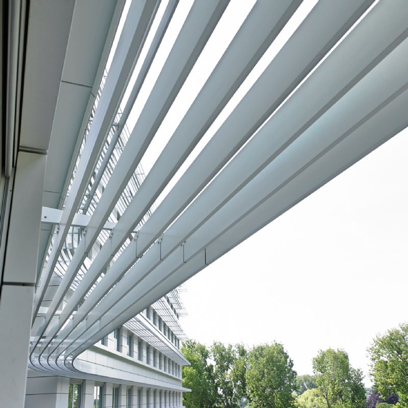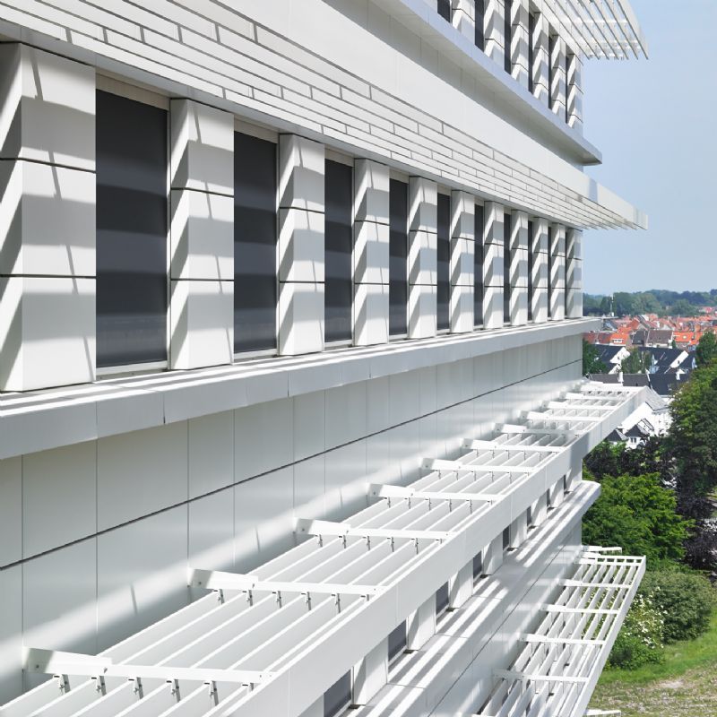 Op andere locaties in het gebouw integreerden de architecten windvaste screens (type Fixscreen Mono AK of Fixvent Mono AK), die een ventilatierooster voor de continue toevoer van verse lucht combineren met een windvaste doekzonwering. Beide systemen zijn uitgerust met een geleidingssysteem met ritsprincipe, waardoor ze zelfs windsnelheden tot 130 km/h weerstaan. Bovendien loopt de screen soepel en geruisloos door de geleiders en de onopvallende onderlat verdwijnt helemaal in de kast bij screens met een hoogte tot 2700 mm, bij hoogtes tot 6000 mm gedeeltelijk. Dankzij de integratie van akoestisch materiaal in de kast van de screen wordt ook elke hinder door omgevingslawaai vermeden.