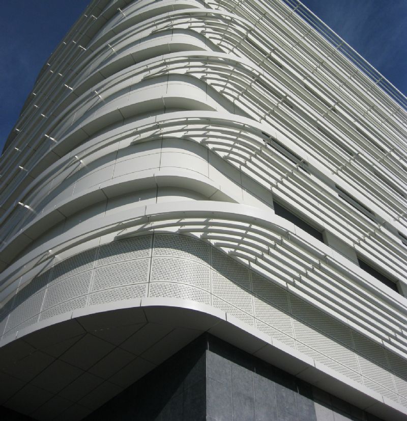 Het Jan Palfijn Ziekenhuis kreeg een compleet nieuwe gevel. Alleen de sokkel, bestaande uit blauwe hardsteen, bleef behouden. De aannemer stripte de rest van het gebouw tot op de betonstructuur, bracht een nieuwe isolatielaag aan, met daarop een waterdichte folie en een witte gevelbekleding uit gelakte aluminium cassettes, die met vloeiende lijnen de verschillende blokken tot een eenheid samenbrengen.