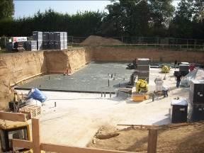 Alle ondergrondse muren zijn opgetrokken uit Stepoc-blokken: holle betonstenen die men eerst droog op elkaar stapelt, die men vervolgens wapent met betonijzer en die daarna nog volgepompt worden met beton. De keldermuren zijn aan de buitenkant bekleed met Foamglas Ready Board. Dit materiaal zorgt in combinatie met de hechtende bitumenlijn en een beschermende en wortelwerende roofing voor een perfecte waterdichtheid. Ook de verbinding tussen de vloer en de muur is volstrekt waterdicht en isolerend. “Door zowel onder de vloerplaat Foamglas Floorboard en voor de muren Foamglas Ready Board te gebruiken, ontstaat een naadloze verbinding die geen koudebrug veroorzaakt,” vertelt Dirk Vertommen van Foamglas. “Door de voegen met koudlijm op te vullen, laat de constructie bovendien absoluut geen vocht door.”