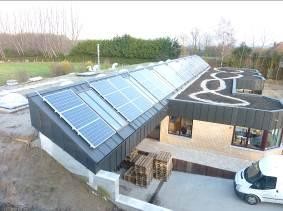 De plaatsing van de Foamglas-blokken en de dakafdichting was in handen van Crabbé dakwerken. Op het dak werden zowel een intensief als een extensief groendak aangelegd. Hiertussen bevindt zich 80 m² aan zonnepanelen en een lichtstraat. Deze is samengesteld uit koepels met spiegels aan de bovenkant. Een gps-module zorgt ervoor dat de spiegels steeds optimaal naar de zon gericht zijn. Het zonlicht wordt naar de zijwanden van de koepel gestuurd en komt via een diffuusfilter terecht in een stockruimte. Het lichtrendement van dit systeem ligt 300% hoger dan wanneer men een traditionele koepel zou gebruiken.