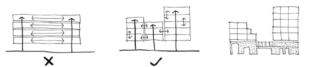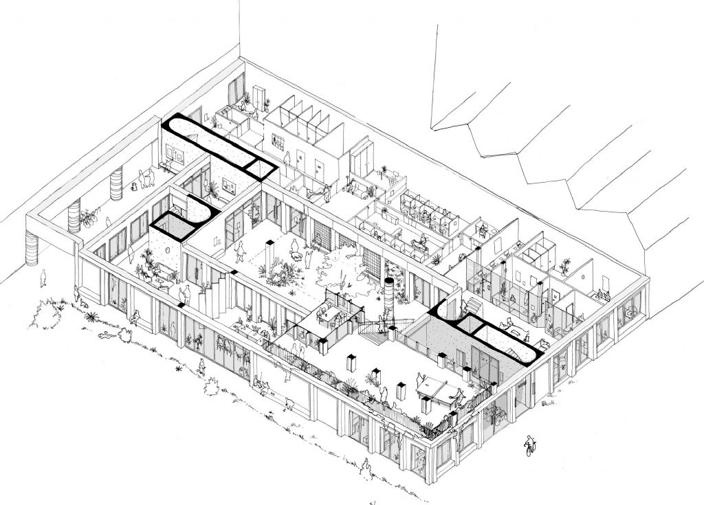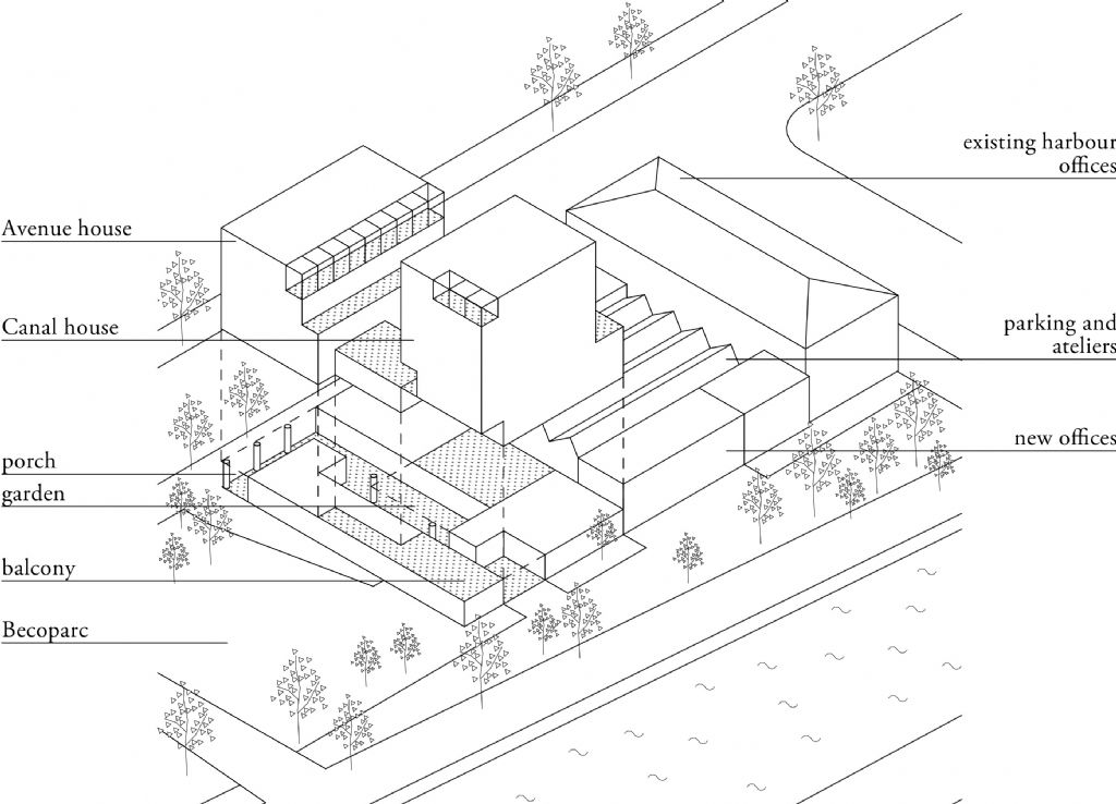 In plaats van een anoniem instituut wordt het project een samengaan van verschillende "huizen", verspreid over verschillende verdiepingen. Ze functioneren autonoom, maar zijn tegelijkertijd onderling goed verbonden. Die opstelling benadrukt het huiselijk karakter van het project. Eerder dan de werking te organiseren op grote plateaus, wordt er ingezet op een verzameling van volumes op een gemeenschappelijke sokkel. Deze sokkel, waar de gebruikers ontvangen en begeleid worden in gastvrije ruimtes, fungeert als een gemeenschappelijke basis voor het hele gebouw. Het omvat een voorportaal, een centrale tuin en een loggia met uitzicht op het kanaal. Het geheel is te vergelijken met de traditionele herberg, die bestaat uit verschillende gebouwen met meerdere verdiepingen verenigd rond een grote binnenplaats en verbonden met de straat door een nieuwe doorgang.