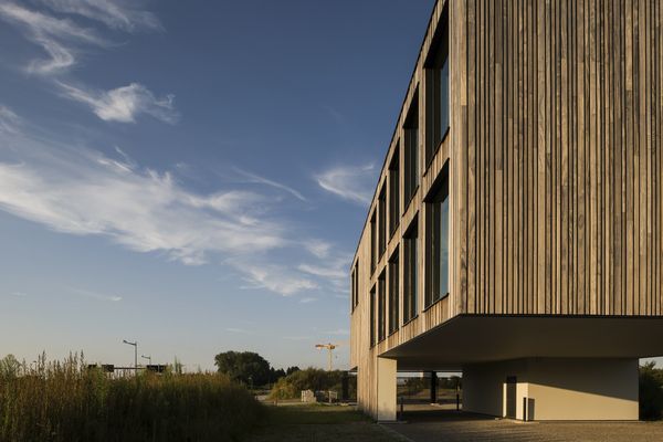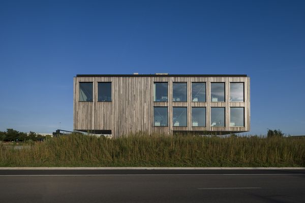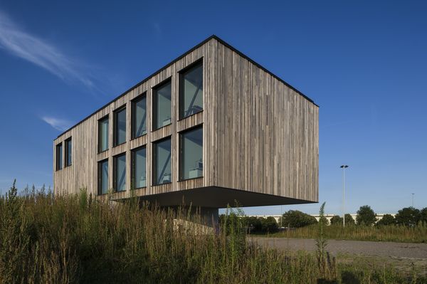 Het kantoor biedt drie bouwlagen, die deels verborgen, deels zichtbaar gemaakt zijn met behulp van padoek-planken en glas. De voeg tussen de planken is opgevuld met een antraciet gelakt aluminium profiel, waardoor het lijkt alsof er een schaduwvoeg is. De achterliggende gevelstructuur is hierdoor compleet onzichtbaar.