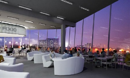 In de vier hoeken zijn er uitstulpingen in de gevel. Hierin zijn verschillende functies gevestigd die een uitzicht geven op het veld. Op de 3de en 4de verdieping is er een business restaurant, Club 50 restaurant en skyboxen. Op de gelijkvloerse verdieping zijn er commerciële ruimtes die distributie en logistiek kunnen huisvesten. Op dit niveau zijn ook perslokalen, spelersfaciliteiten en opslagruimte voorzien. Op niveau 1 bevindt er zich een ontvangstlounge. Aan de rechterkant bevinden zich de kantoren van de NV Optima op het gelijkvloers, de eerste, derde, vierde en vijfde verdieping. Op de derde verdieping zijn er nog te verhuren kantoorruimten.