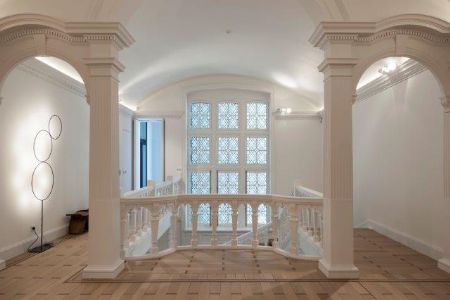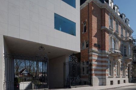 Niet enkel in het herenhuis zelf, maar ook aan de buitenkant wist Bontinck die belangrijke historische waarde te benadrukken. “Via de bouw van het strakke nieuwbouwvolume hebben we de gevelrij aan de Coupure eindelijk kunnen sluiten,” aldus Van Thourhout. “Voorheen werd het herenhuis geflankeerd door een grote blinde gevel van een appartementsgebouw uit de jaren 70, wat een niet al te fraai zicht opleverde. Ze werden van elkaar gescheiden door een mooi hekwerk, dat we eveneens hebben weten te integreren in de nieuwe constructie. Het nieuwbouwvolume zweeft boven dit hekwerk uit. Zo creëerden we meteen ook een doorrit naar de tuin en de ondergrondse parking aan de achterkant van het gebouw. Om het contrast tussen het bestaande herenhuis en het resoluut hedendaagse nieuwbouwvolume niet al te groot te maken, worden zij op hun beurt van elkaar gescheiden door een glazen kern met een panoramische lift. Deze bevindt zich echter drie meter achter het gevelniveau, zodat het effect van het 'blokje' toch ook nog zichtbaar is. Om de visuele link met de klassieke gebouwen langs de Coupure toch levendig te houden, werd het blokje anderzijds volledig ingepakt met een charmante witte natuursteen.”