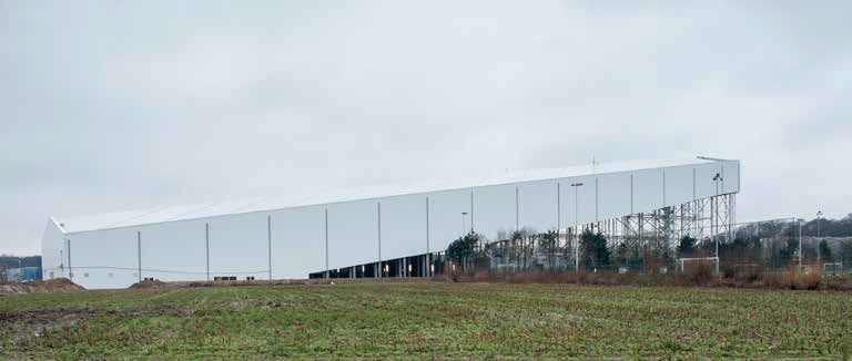 “Aan de achterzijde van de hal bevindt zich een stalen trappentoren die uitmondt in een technisch platform”, gaat Stefaan Callens verder. “De rest van de constructie bestaat uit steeldeck (dakplaten en ondersteuning voor koelingsbuizen boven pistevloer), sandwichpanelen (gevelsluitingen, pistevloer, bekleding toegangen en lokalen in de piste), geperforeerde roostervloeren (trappen, terrassen en passerelles) en een koudgeplooid profiel onder de sandwichpanelen van zone B dat condens vermijdt. Er zijn plannen om onder zone A nog twee extra vloerniveaus te voorzien: enerzijds een vloer uit zelfdragende hyperstatische platen op 3,5 meter hoogte met het oog op extra parking, en anderzijds een vloer uit balken en gewelven op 7 meter hoogte voor de inrichting van een klim- en boulderzaal en andere activiteiten (waarbij de zijkant ook bekleed zal worden met sandwichpanelen). Qua stabiliteit en windverbanden is de constructie berekend op deze bijkomende invullingen.”
