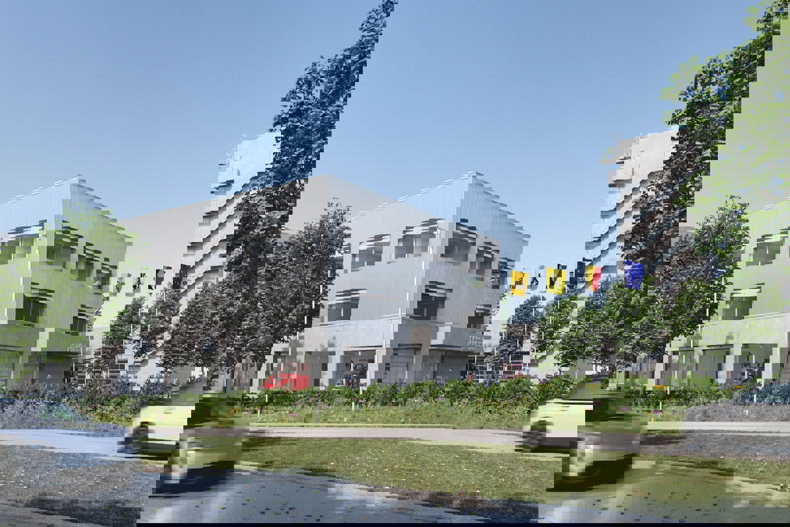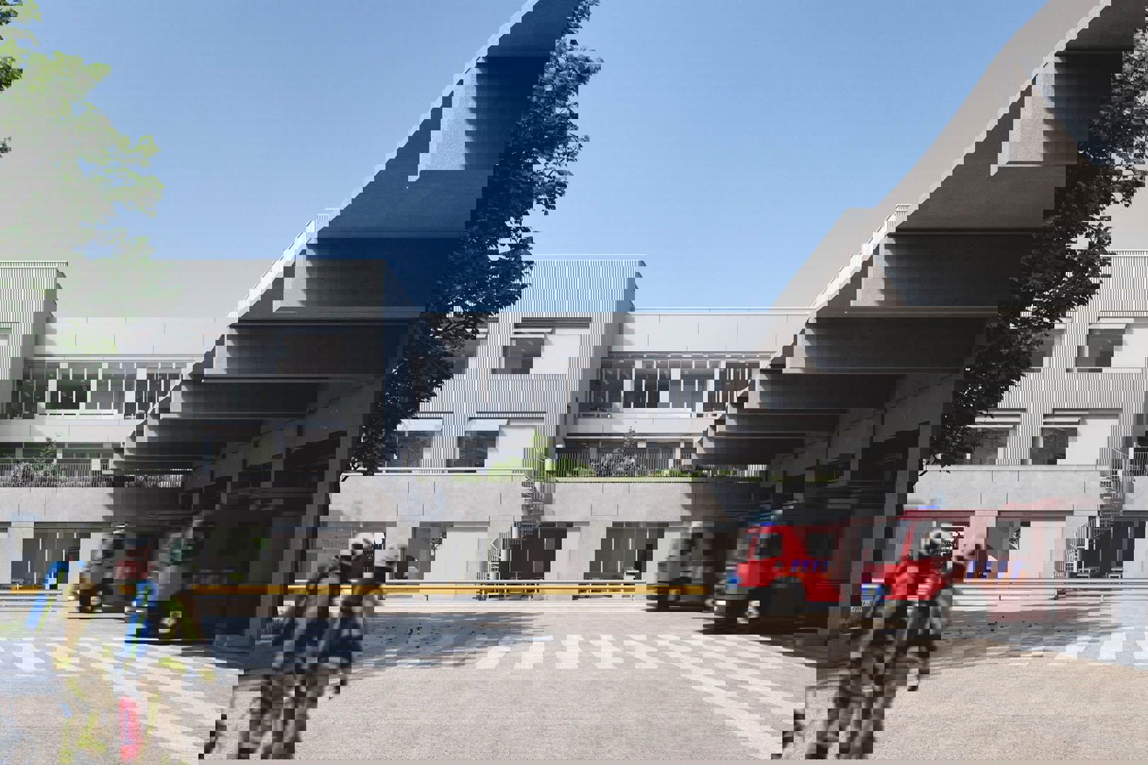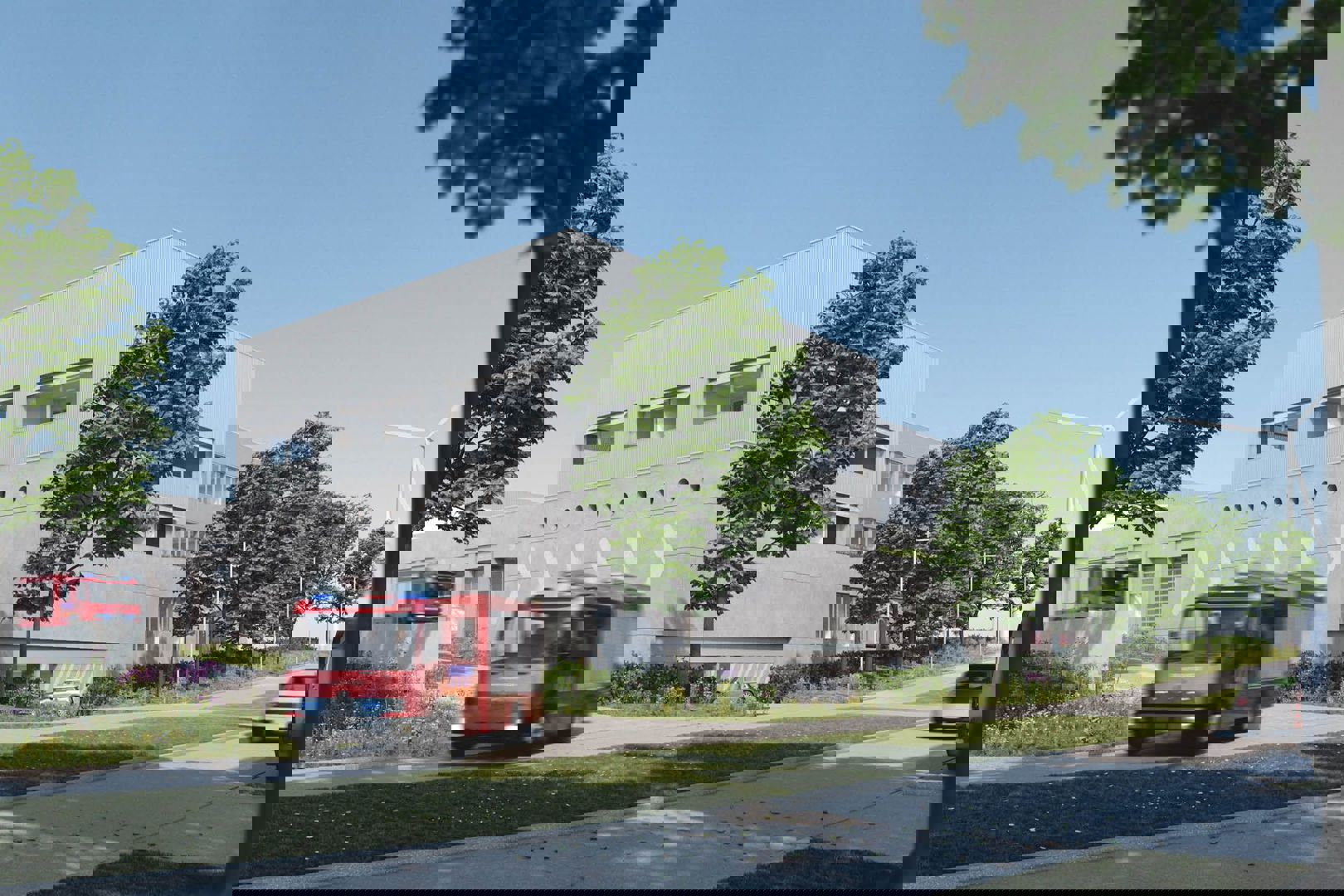 Die dualiteit vertaalt zich ook in de materialisatie. De stevige betonnen sokkel geeft het gebouw een onverzettelijke basis die past bij de rol van een veiligheidscentrum, terwijl fijn gedetailleerde aluminium accenten het volume een lichte en eigentijdse toets geven. Het grijze palet wordt doorbroken door de dynamische veiligheidskleuren die eigen zijn aan een brandweerkazerne, waardoor het geheel een duidelijk en herkenbaar karakter krijgt. Langs de parkzijde zorgen afgeronde vormen en open verbindingen voor een zachte inbedding in het landschap, met aandacht voor water, vegetatie en biodiversiteit.