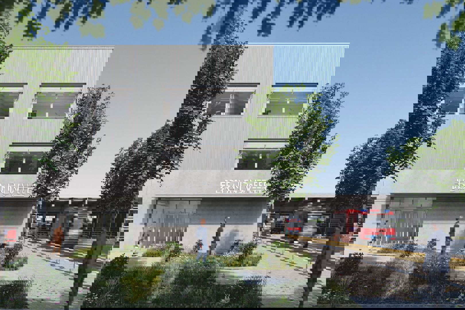 Het ontwerpteam vertrekt daarbij van een herkenbare en tegelijk gelaagde vormentaal. De nieuwe kazerne is opgevat als een hedendaagse interpretatie van de klassieke vierkantshoeve, met een groene binnentuin als rustpunt te midden van de intensiteit van het operationele werk. Rond die centrale buitenruimte worden alle functies georganiseerd: van dispatching en interventiezones tot logistiek en administratie. Zo wordt de dagelijkse werking gestroomlijnd, met ruimte voor zowel snelheid en paraatheid als voor concentratie en reflectie. De kazerne fungeert als regulator van verschillende ritmes en noden, zonder aan helderheid en oriëntatie in te boeten.